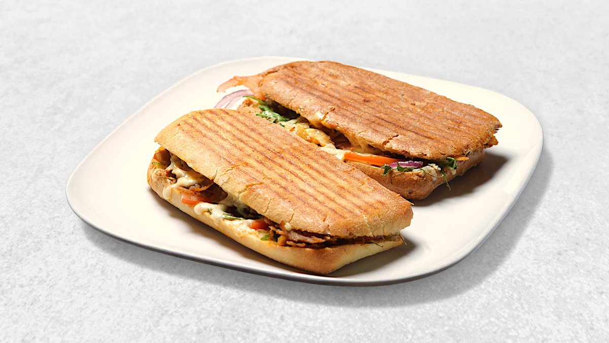 Grillet sandwich med fyld af valgfri protein, ost, rucola, løg, tomat, pesto og alinas dressing.