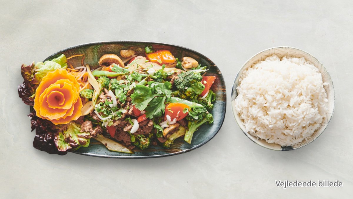 Suppe: Peking suppe Forret: Hjemmelavet kylling på spyd Hovedretter: Andesteg med bambusskud og champignon Gong bao oksekød med cashewnødder (stærk) Indbagt kylling med sur-sød sauce Indbagte rejer med sur-sød sauce Serveres med ris.