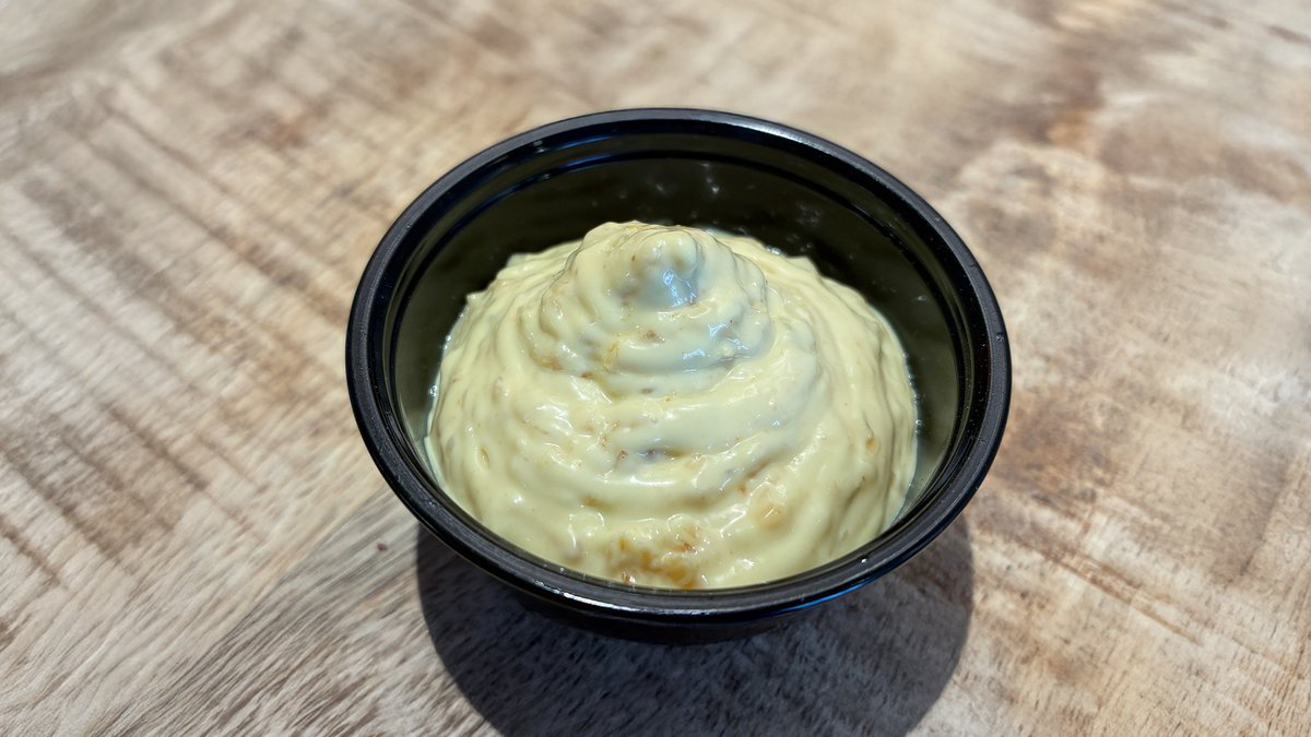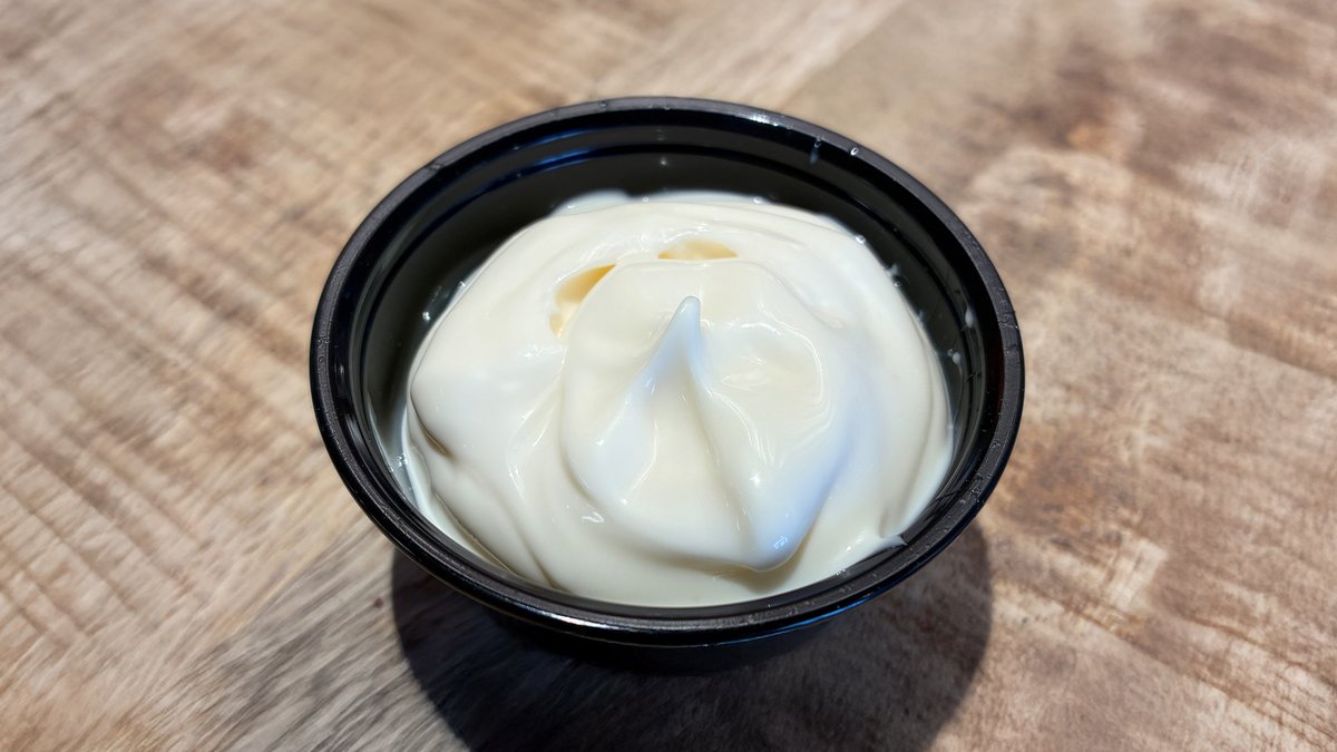 Mayonnaise, rødløg, hjemmelavet agurkesalat, rødkål og ribbenssteg serveret i en briochebolle.