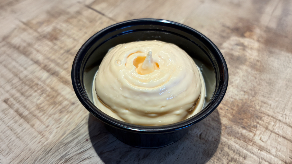 Sennep, ketchup, rødløg, hjemmelavet agurkesalat, ost og en bøf fra Gastro kalv, serveret i en briochebolle.
