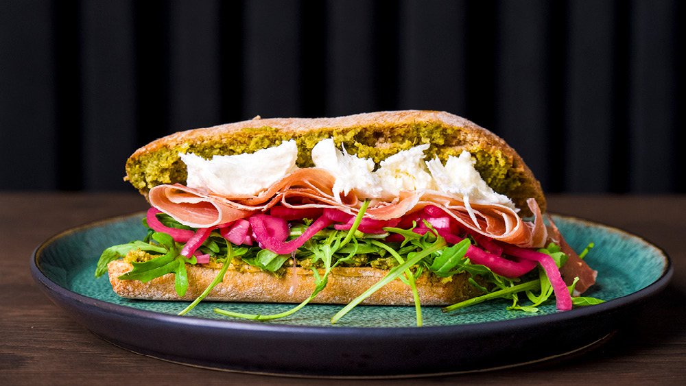 Sandwichbrød m/serrano skine & mozzarella - anrettet med salat, tomat og pesto