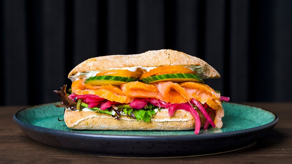 Sandwich m/laks, salat, tomat, syltet rødløg & hjemmerørt dressing