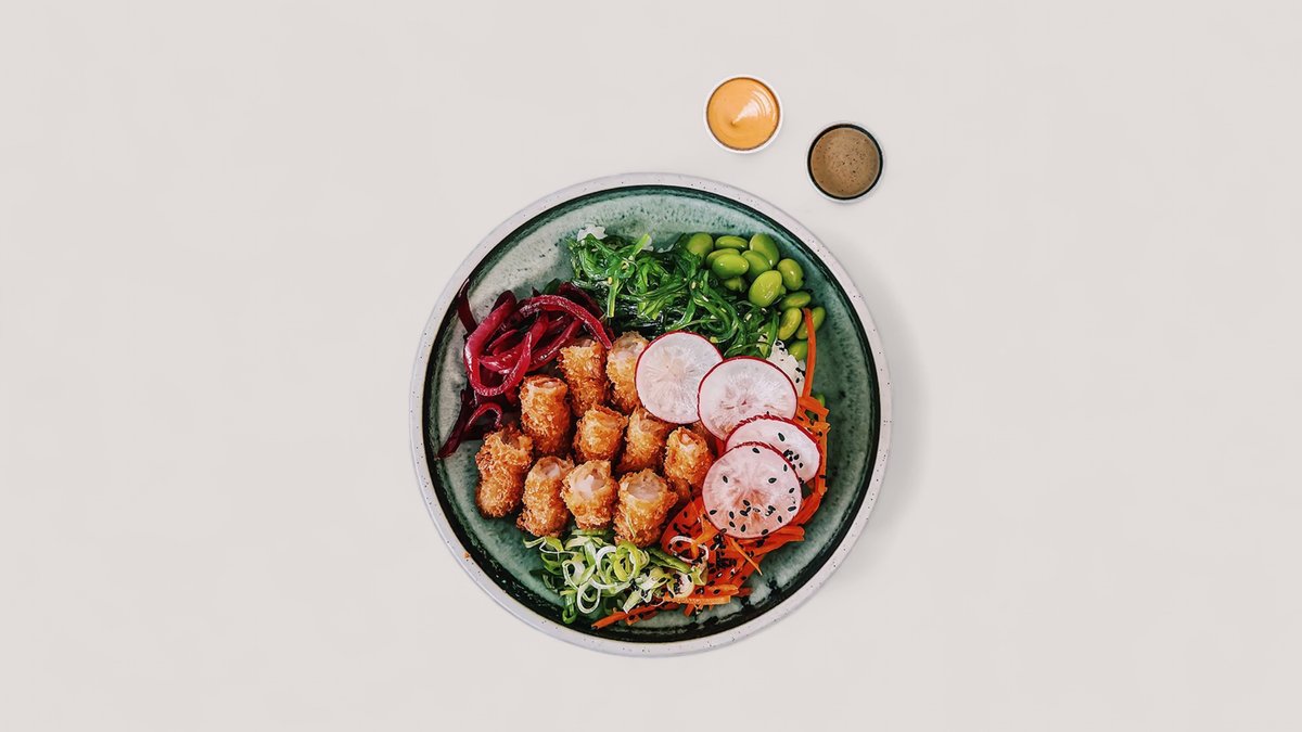 Bowl med fyld af ris, tempurarejer, tangsalat, edamame, syltede rødløg, gulerod, forårsløg og sort sesam. Serveres med gomadip og chilimayo.