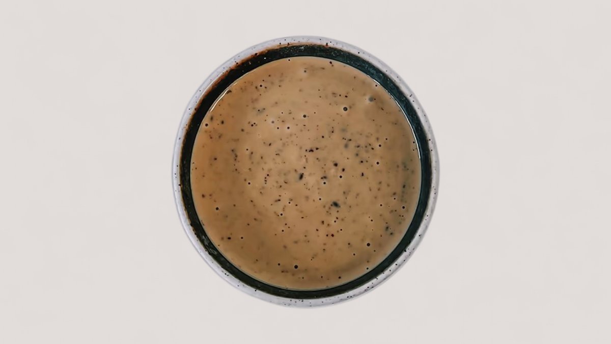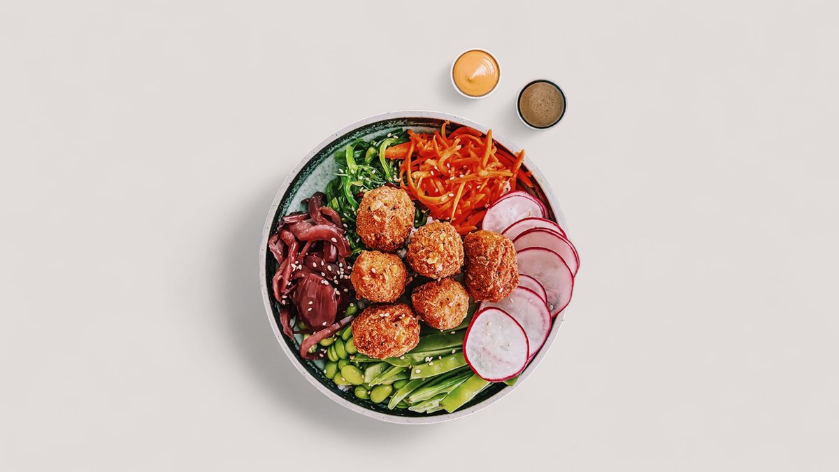Bowl med fyld af ris, pankopaneret velfærdskylling, sukkerærter, tangsalat, edamame, syltede rødløg, gulerod, forårsløg og hvid sesam. Serveres med gomadip og chilimayo.