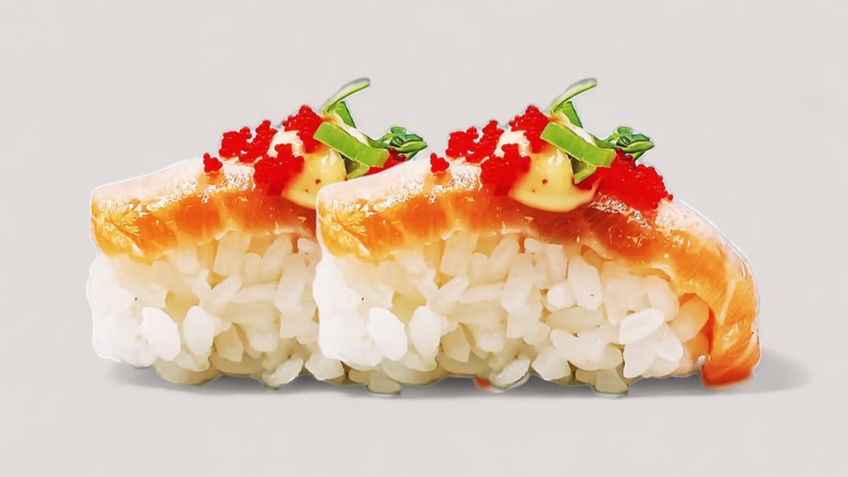 Surimi, avocado og agurk, toppet med lynstegt laks, rød masago, forårsløg, unagi sauce, mayo