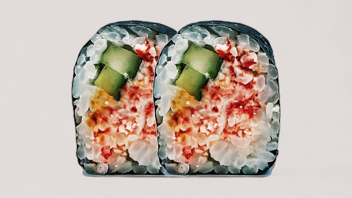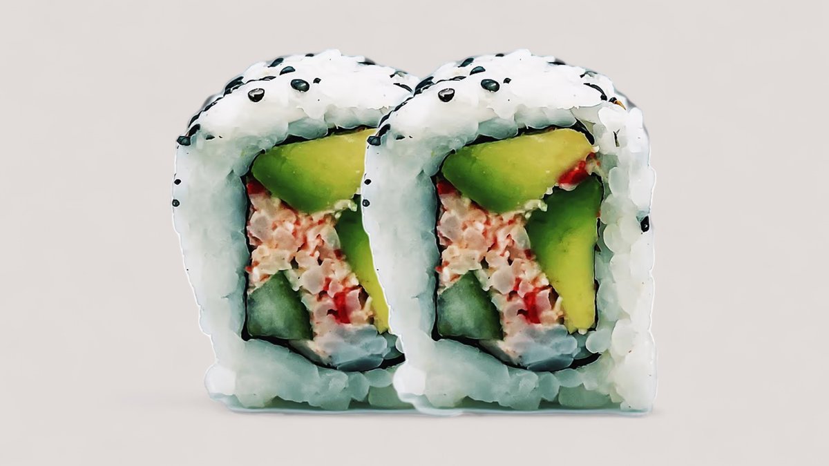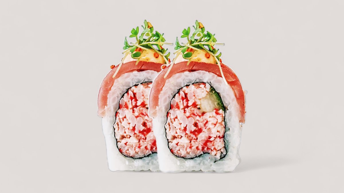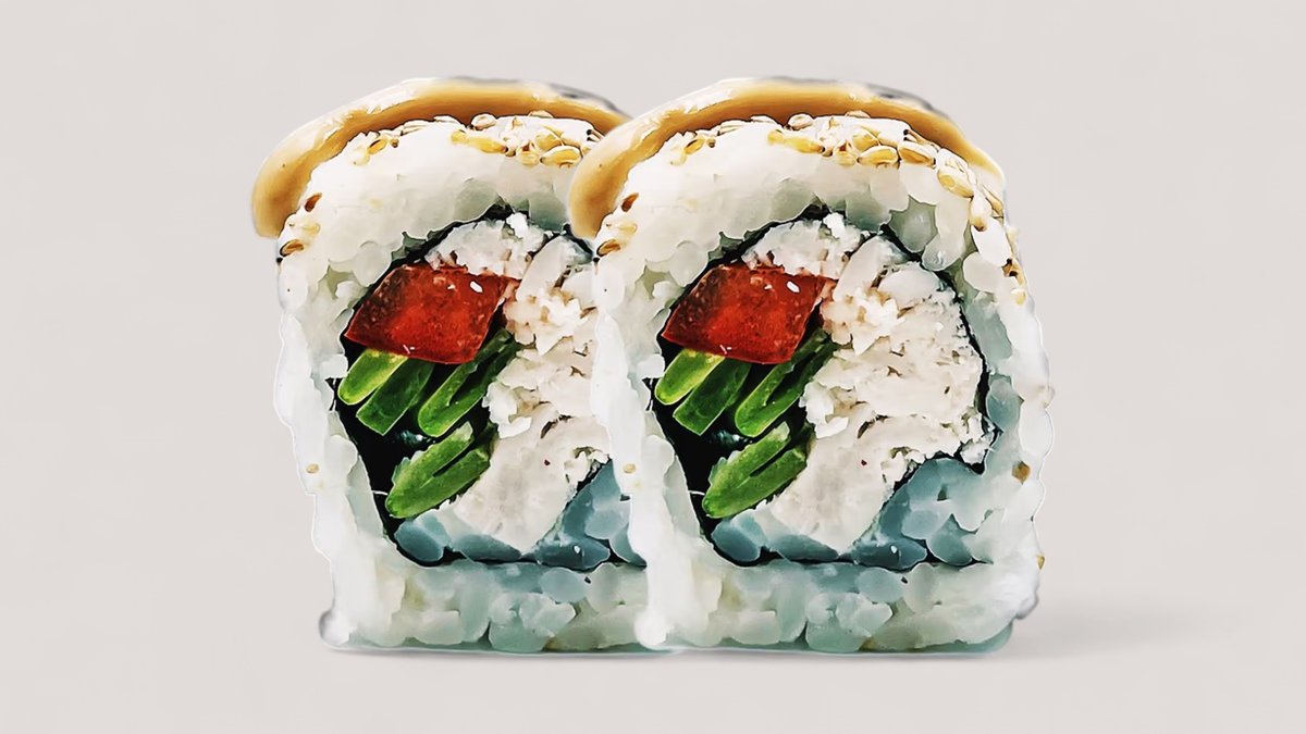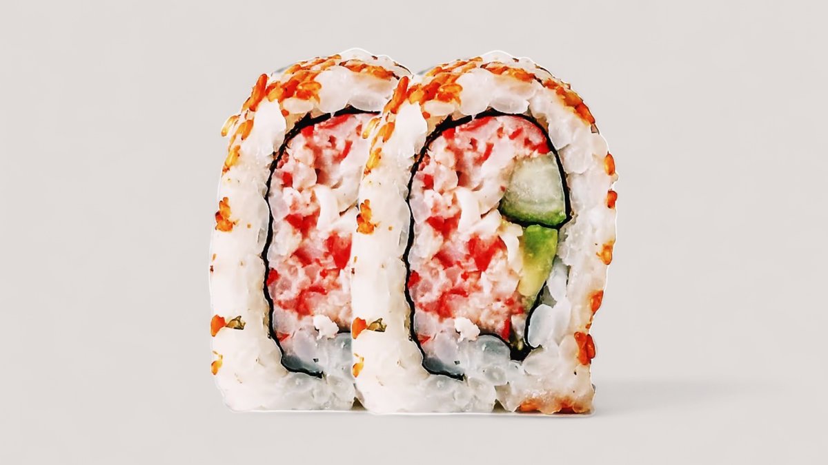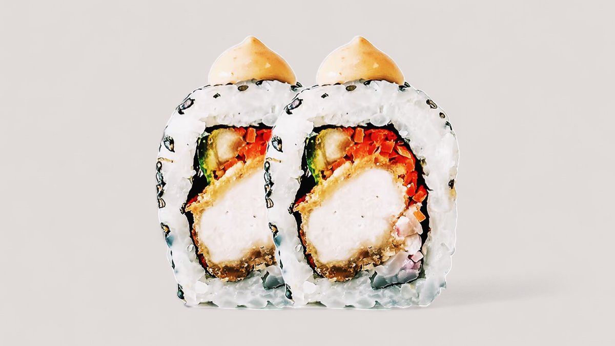 Tempurareje, avocado, agurk, mangomayo, toppet med crispy surimi og grøn masago