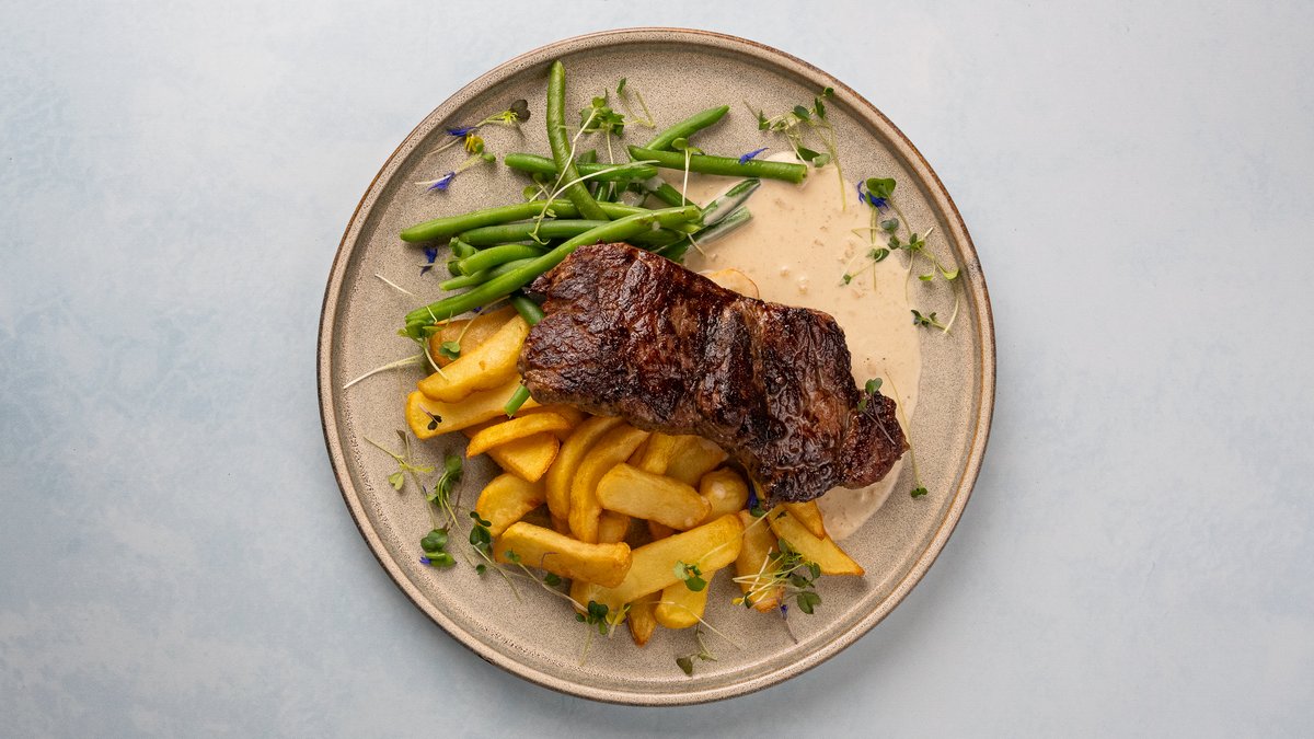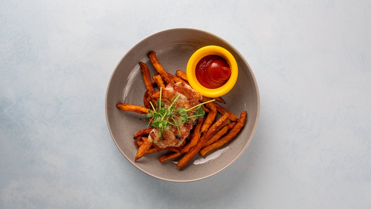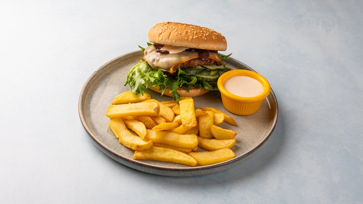 suitsujuust, sibulamoos, friikartulite ja kastmega