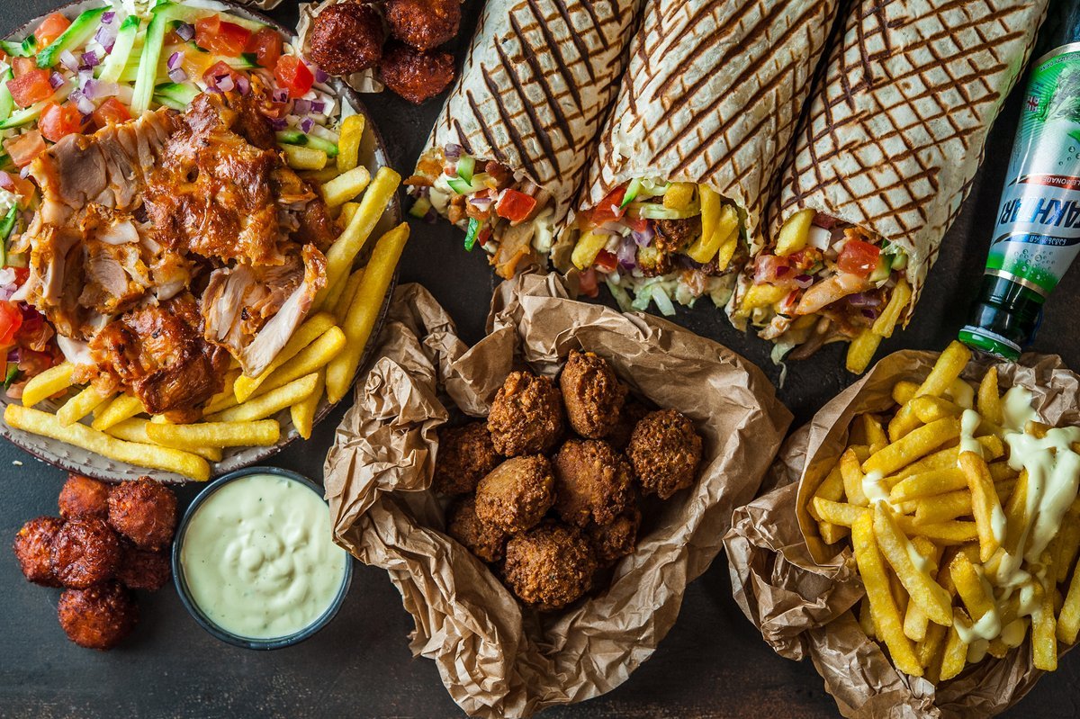 Kebab, pizza, burger & baklava.