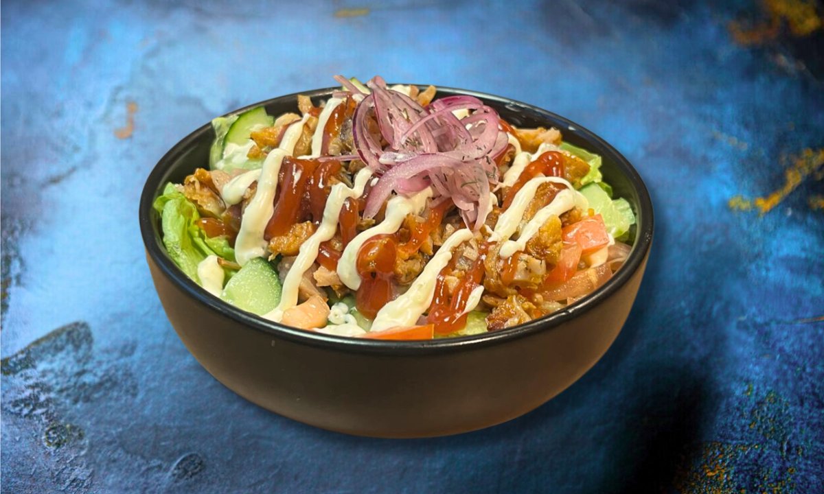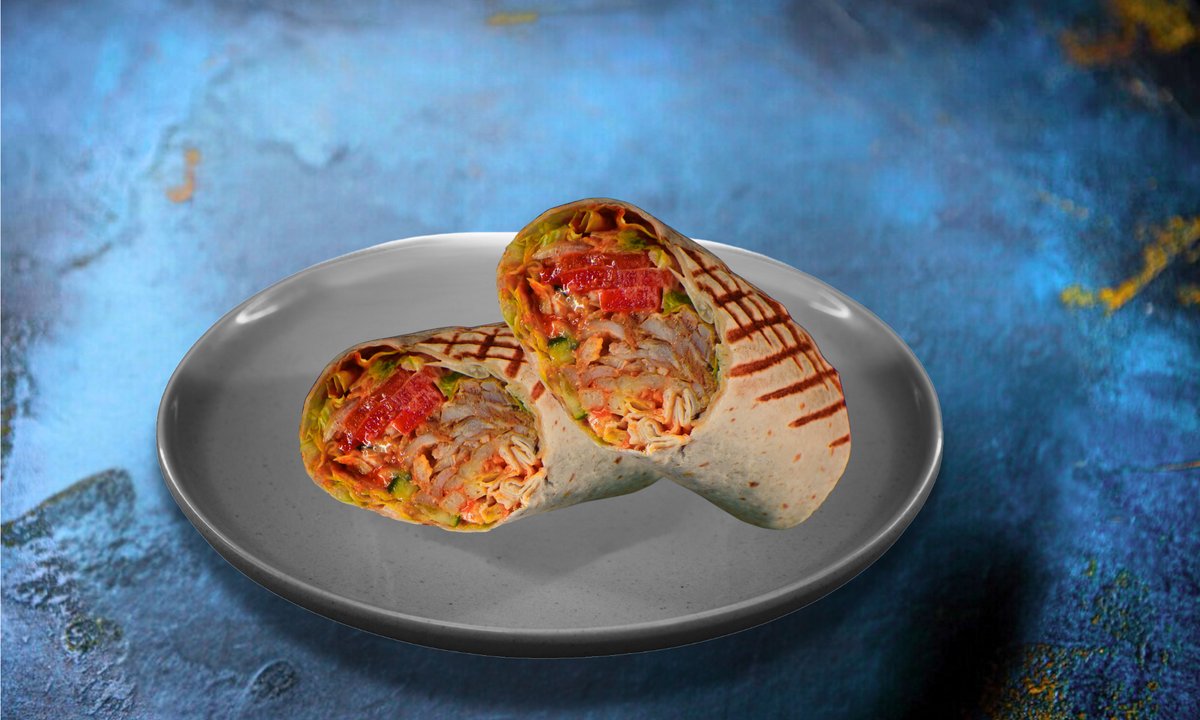 Tortilla, kana kebab, cheddar cheese, peekon, kurk, tomat, küüslaugukaste, juustukaste, sibul