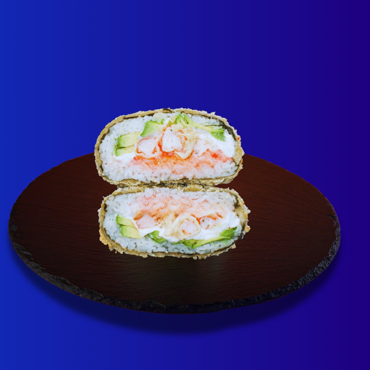 Sushi burger lõhega(lõhe,avokaado,kurk,kremijuust, kaste) ,Sushi burger krevettidega(lumekrabi,krevettid,kurk,avokado,kaste)