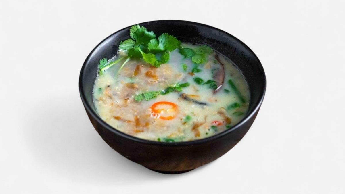 basmatiriis, tšilli, küüslauk, punane sibul, porgand, porru, pošeeritud muna, cayenne’i pipar, kalakaste, kecap manis, roheline sibul, seesamiseemned