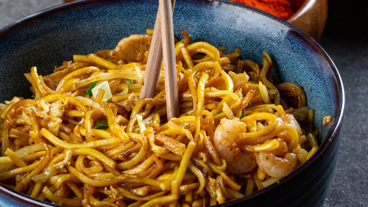Vokitud peenikesed riisinuudlid kana, krevettide, muna ja pähklitega, kalakastmega.