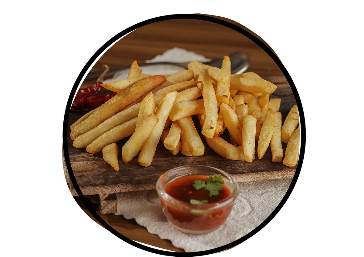 Friikartulid, kana-, veise- või seguliha massist tehtud lihalaastud, hapukurk, porgand, sibul, salat. Valge kaste (küüslauk, hapukoor, majonees).