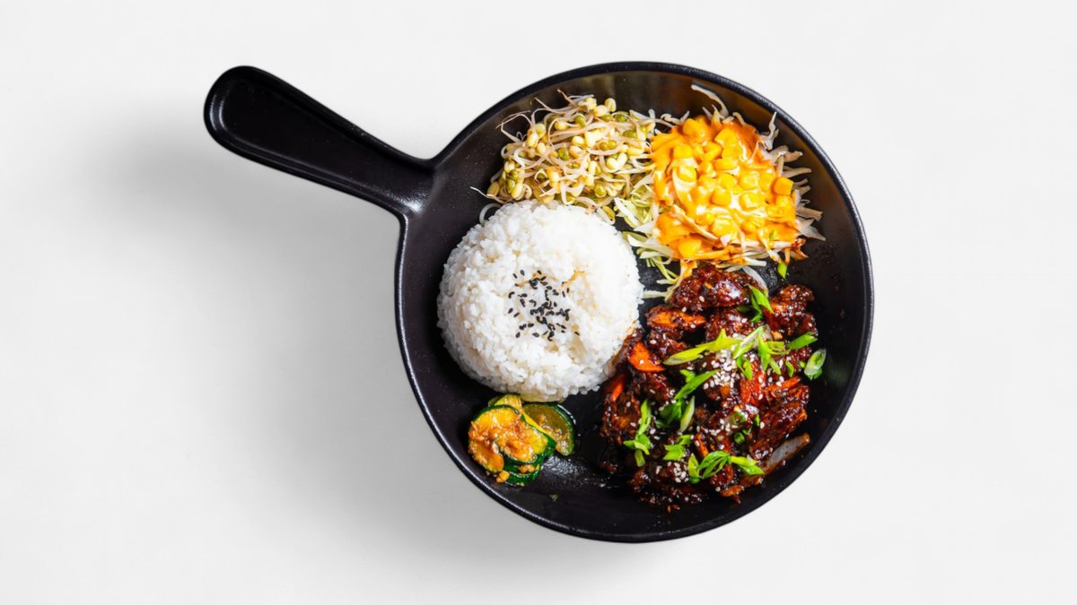 Viilutatud kanarindfilee, bulgogi kaste, sibul, porgand, küüslauk, riis, Korea kapsasalat, Korea tšillikaste, suvikõrvits, oad