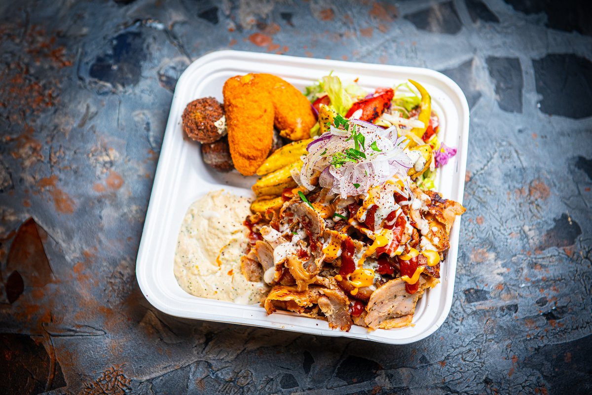 Fries, salad, döner, falafels, jalapeño cheese bites, hummus