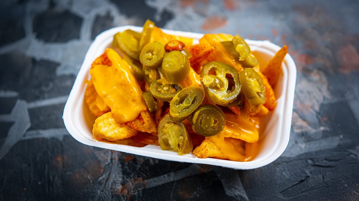 Fries with cheddar cheese and jalapeño slices
