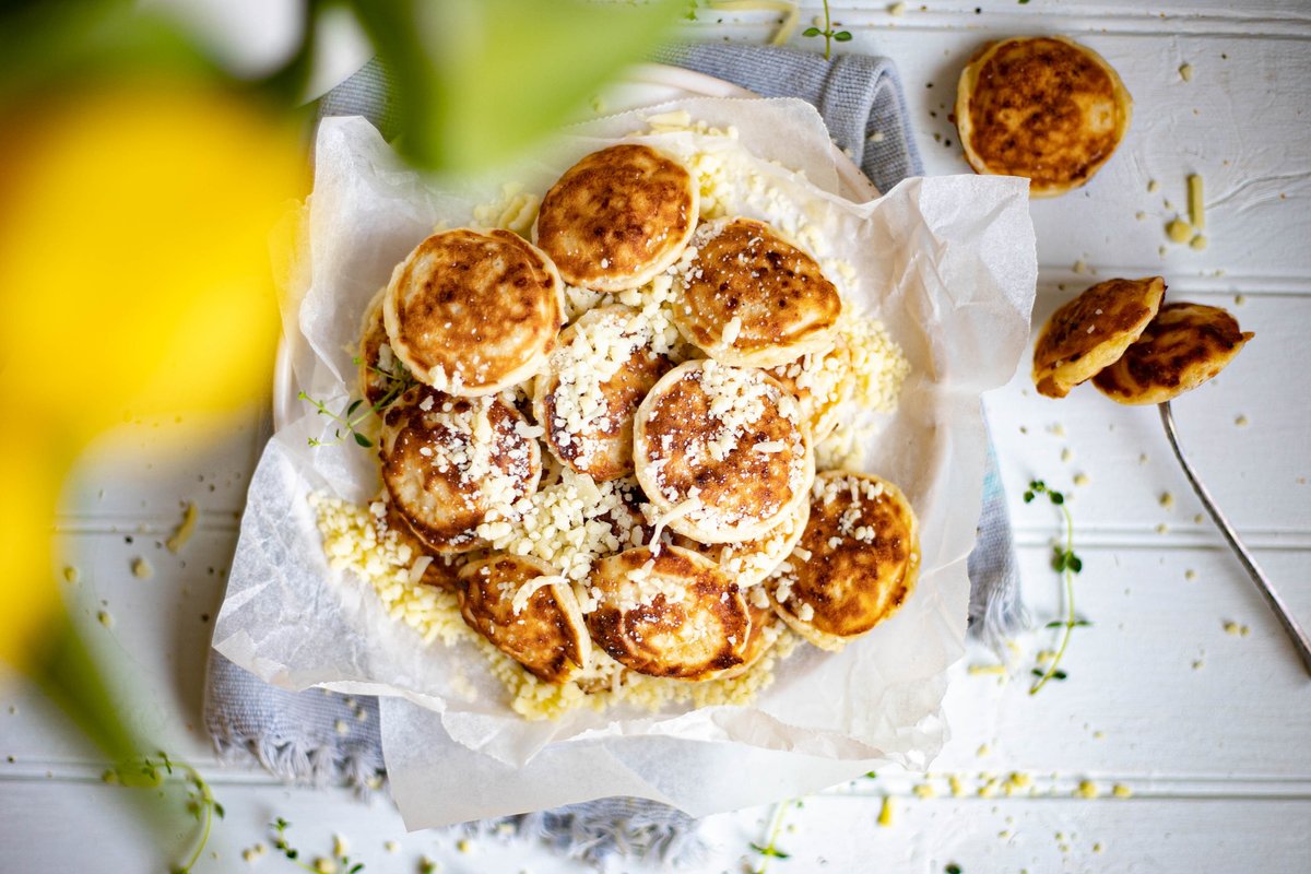 Need juustused minipannkoogid meeldivad eriti neile, kes lihast ja kalast suurt ei hooli. Vali juurde kastmed ja naudi maitseid. Julged proovivad ka vaarika toormoosiga. Üks inimene saab mõnusalt kõhu täis ca 20-25tk minipannkoogist. Lisandite planeerimise spikker: 25 kooki: 2 lisanditopsi (a´50ml), 50 kooki: 3-4 lisanditopsi (a´50ml)
