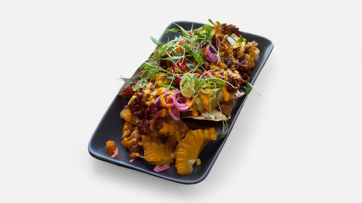 Tortillakrõpsud, avokaadokreem, Cheddar juustukaste, mango-habanero salsa, marineeritud sibul, Chili con Carne. Sobib jagamiseks!