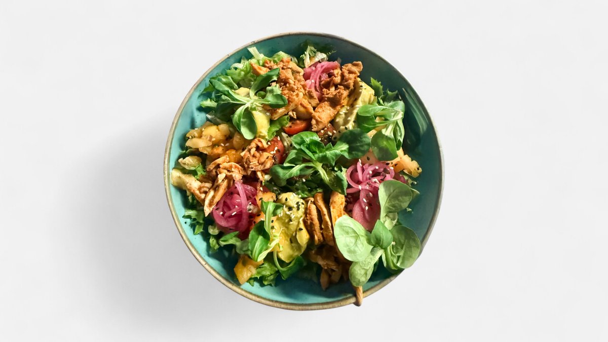 Avokaadokreem, kirsstomatid, maisikrõpsud, marineeritud sibul, jääsalat, mais, mango-habanero salsa