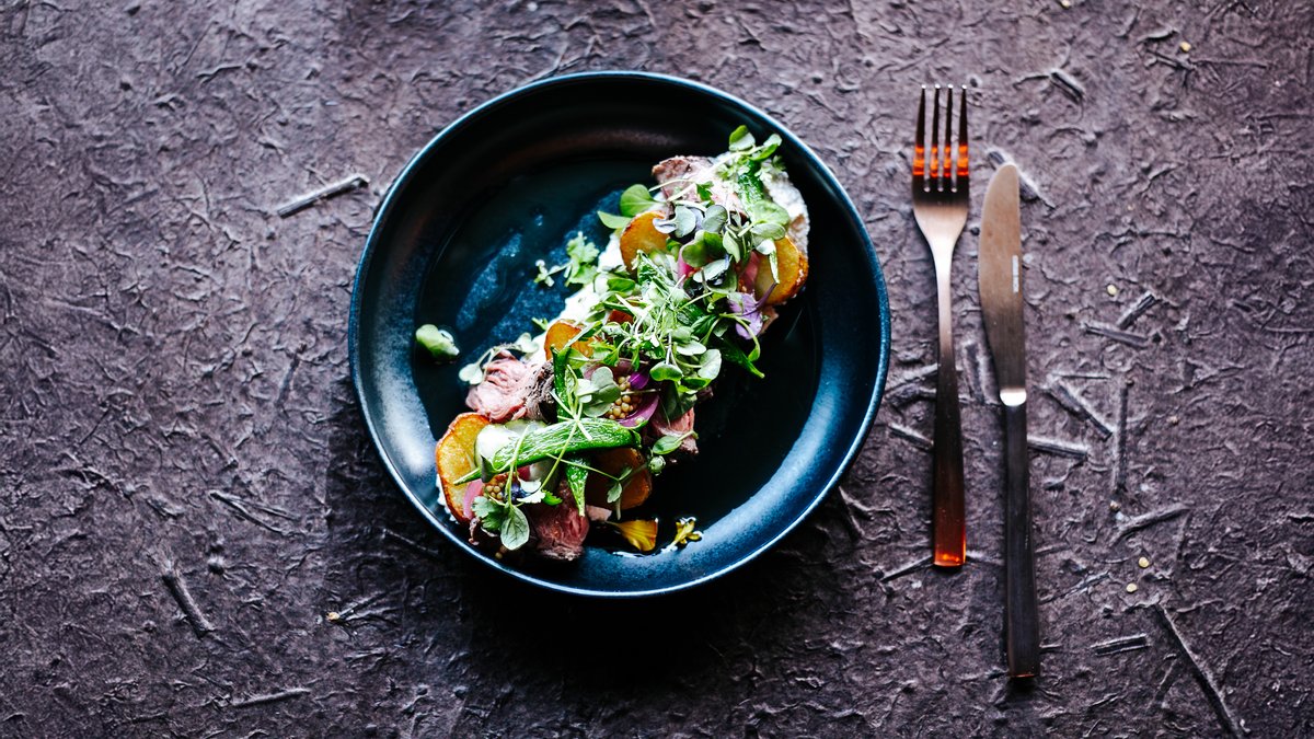 Piprakoorikus rostbiif, röstitud kartulid, marineeritud sibul, kurgiäkis, suhkruherned, mädarõikavaht, suitsutatud aioli