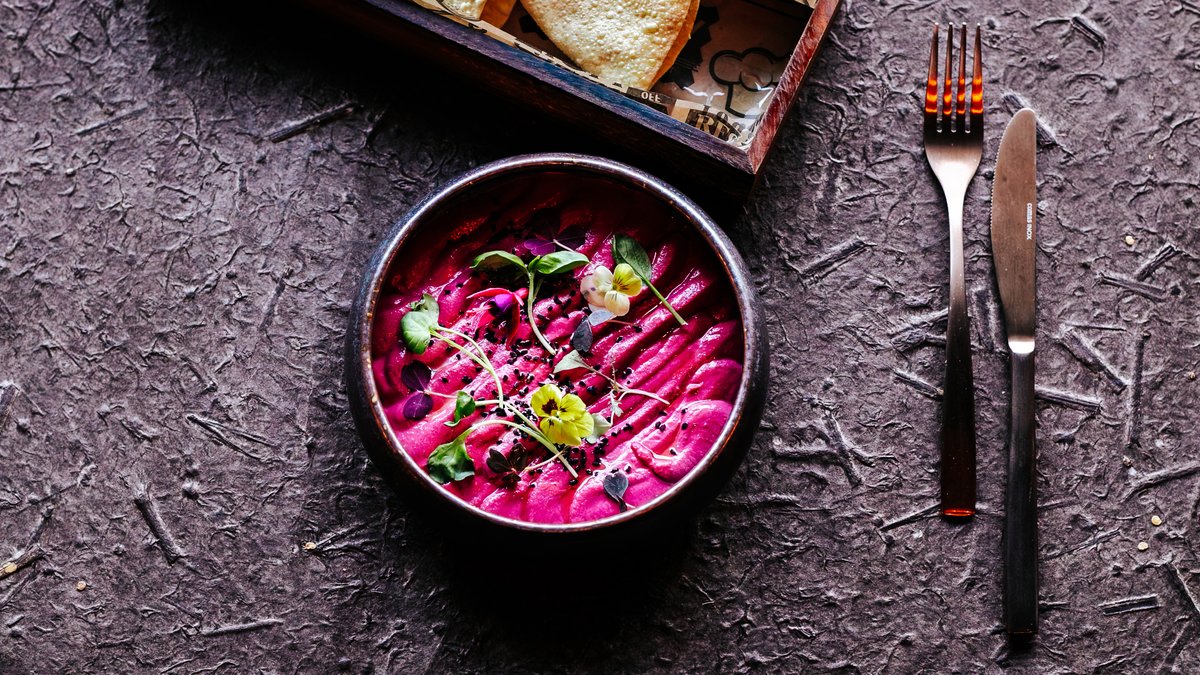Käsitöö peedihummus, läätsekrõps, sibulaseemned, oliiviõli, aiaürdid