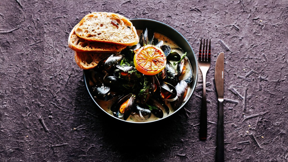 Sinimerekarbid 500g, valge veini kaste, röstitud sidrun, grillitud ciabatta