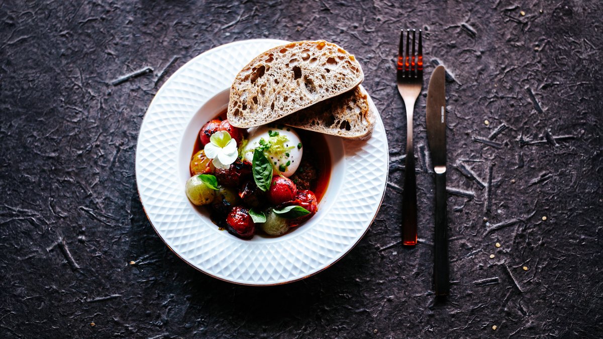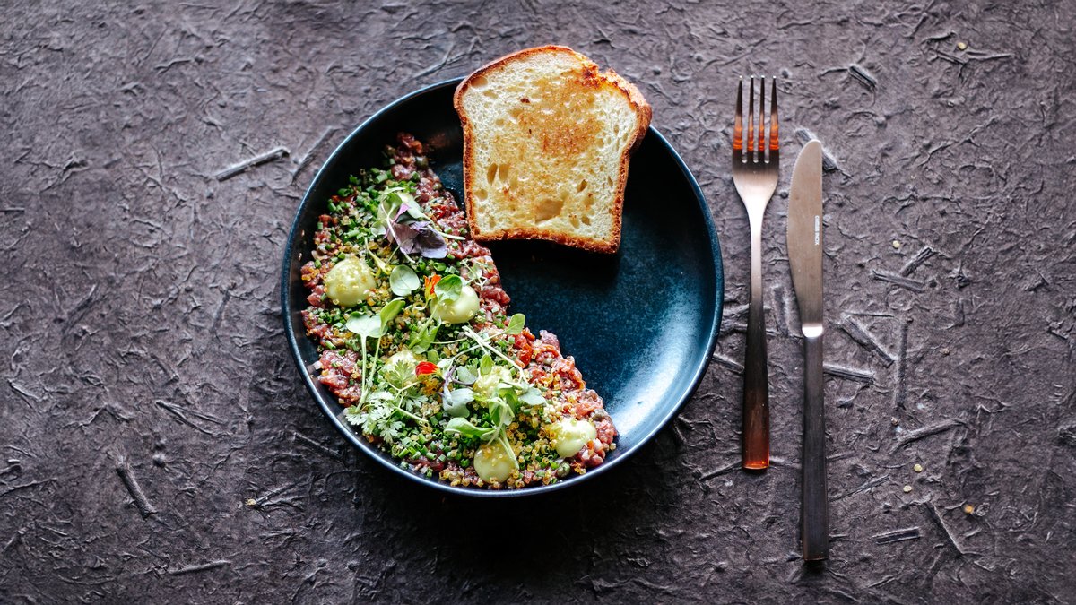 Veisetartar, viin, kapparid, päikesekuivatatud tomatid, sinepiseemned, šalottsibul, vürtsikas kaste, sojakastmes soolatud munakollane, tilli ja küüslaugu aioli, krõbe brioche