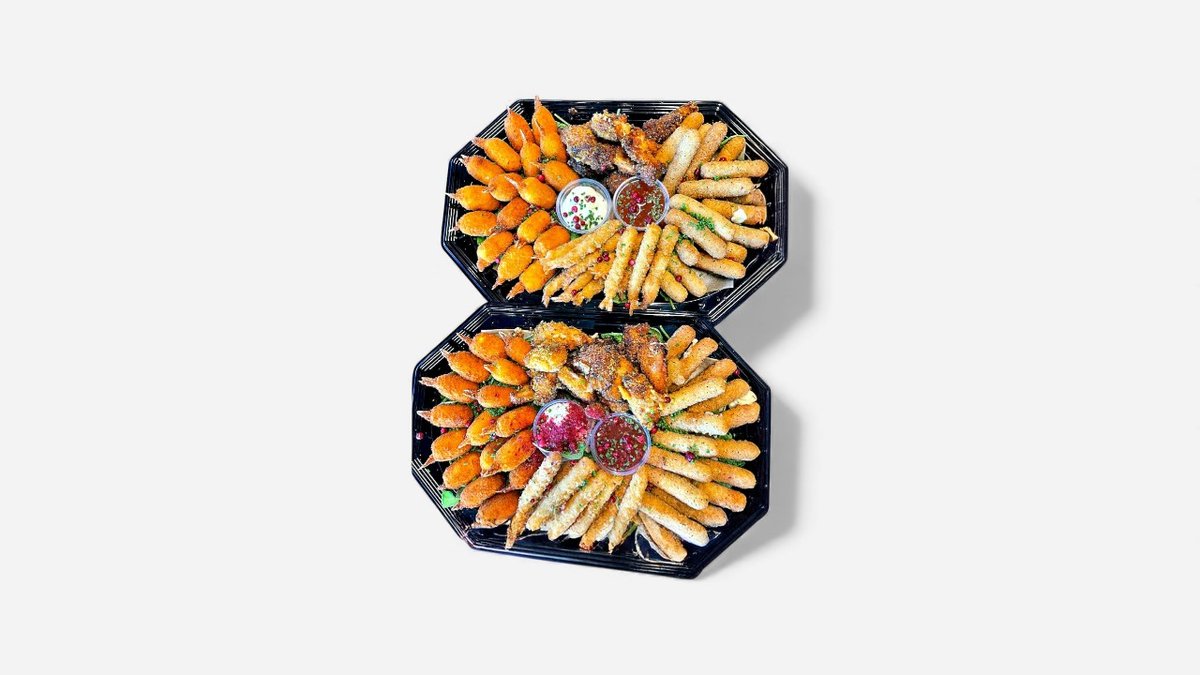 Krõbekana, mozzarella juustupallid, paneeritud krevetid, paneeritud krabisõrad, murulaugu aioli ja sweet chilli kaste. 1 vaagen 2kg