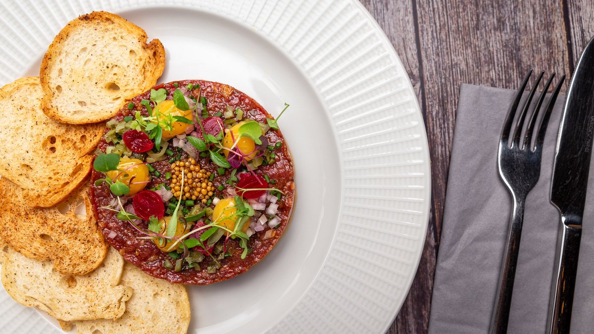 Veiseliha tartar, koduneadžika, munakollane, marineeritudpärlsibul, šalottsibul, kurkCornichon, murulauk