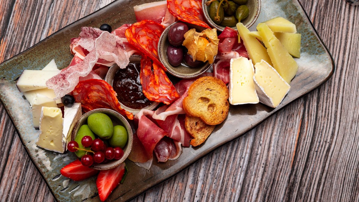 Erinevate juustude ja lihade valik, rohelised ja mustad oliivid, apelsiniMOOS, kapparid, riisikrõpsud