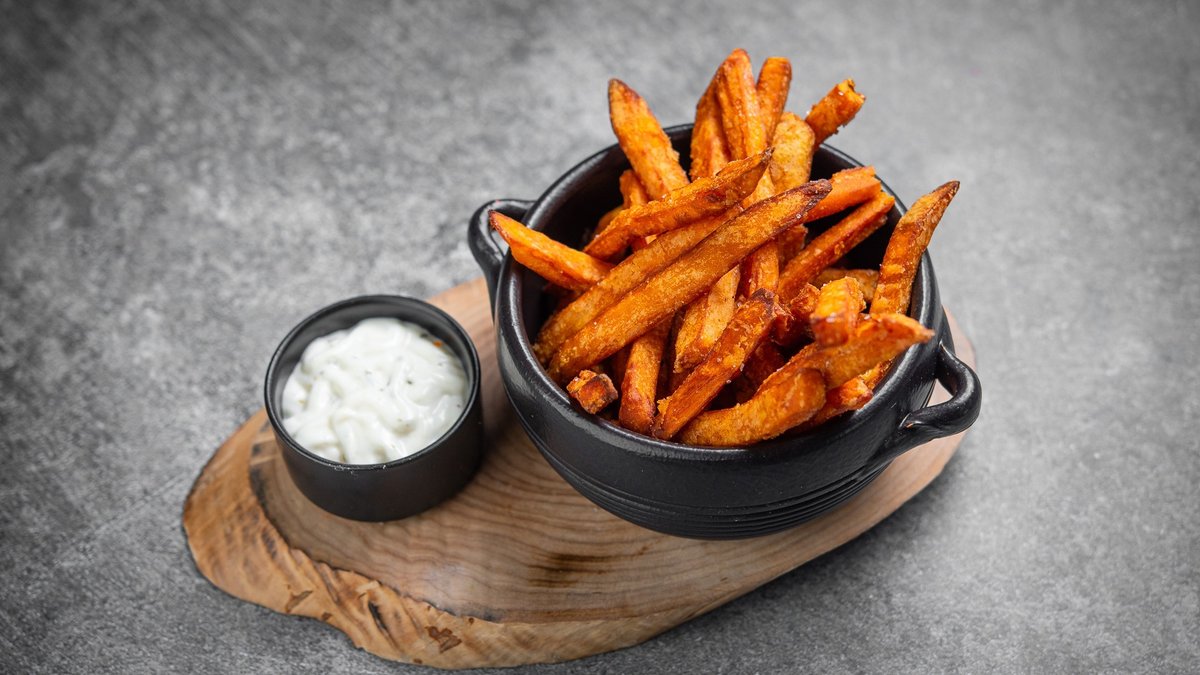 Krõbe kanafilee paneeringus, Brioche nupsusai, terav mango kaste, marineeritud punane kapsas, frillis, marineeritud kurk, friikartul