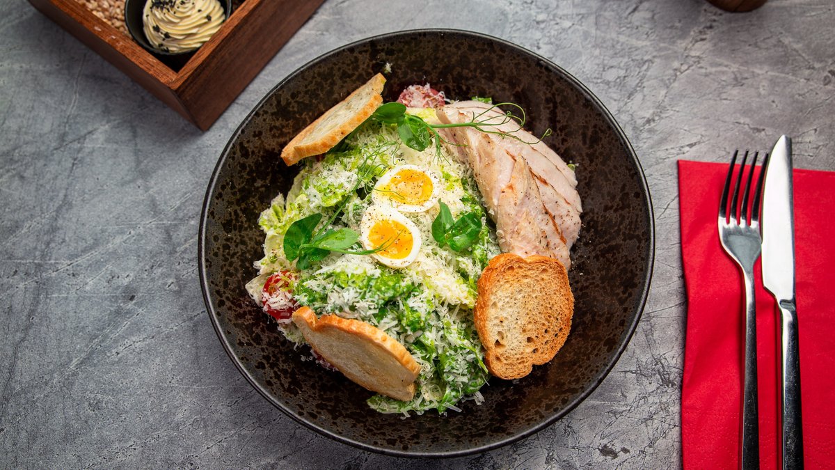 Rooma salat, Caesari kaste, kirsstomatid, vutimuna, krutoonid, sütel grillitud kana, laagerdunud juust
