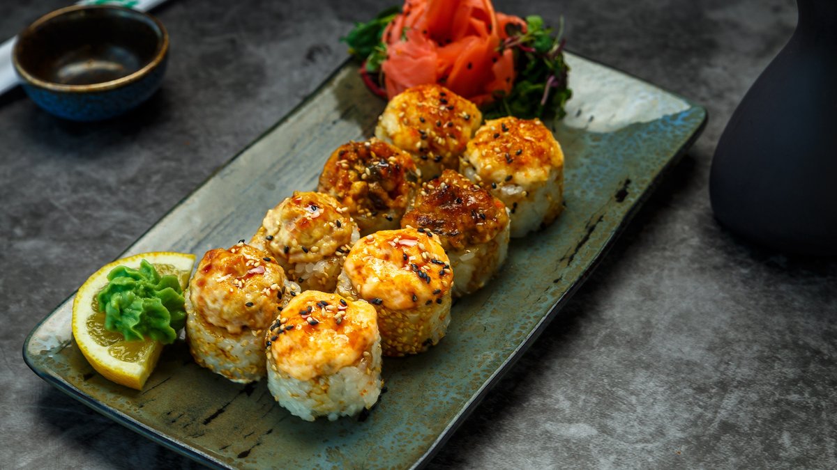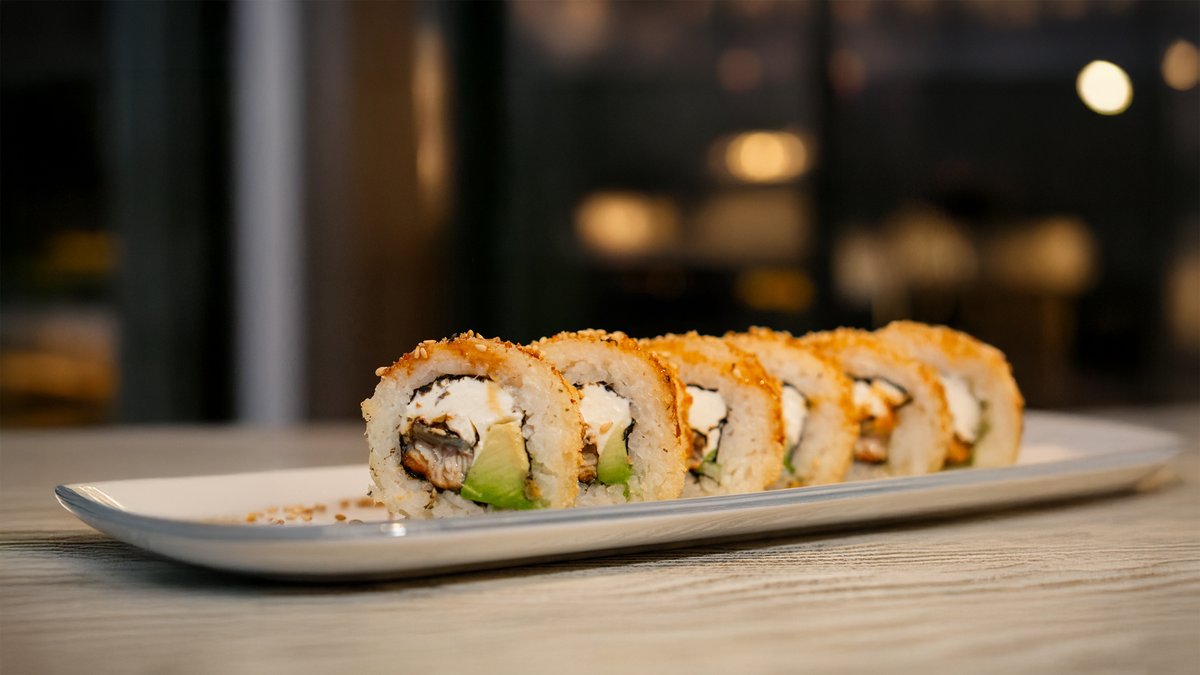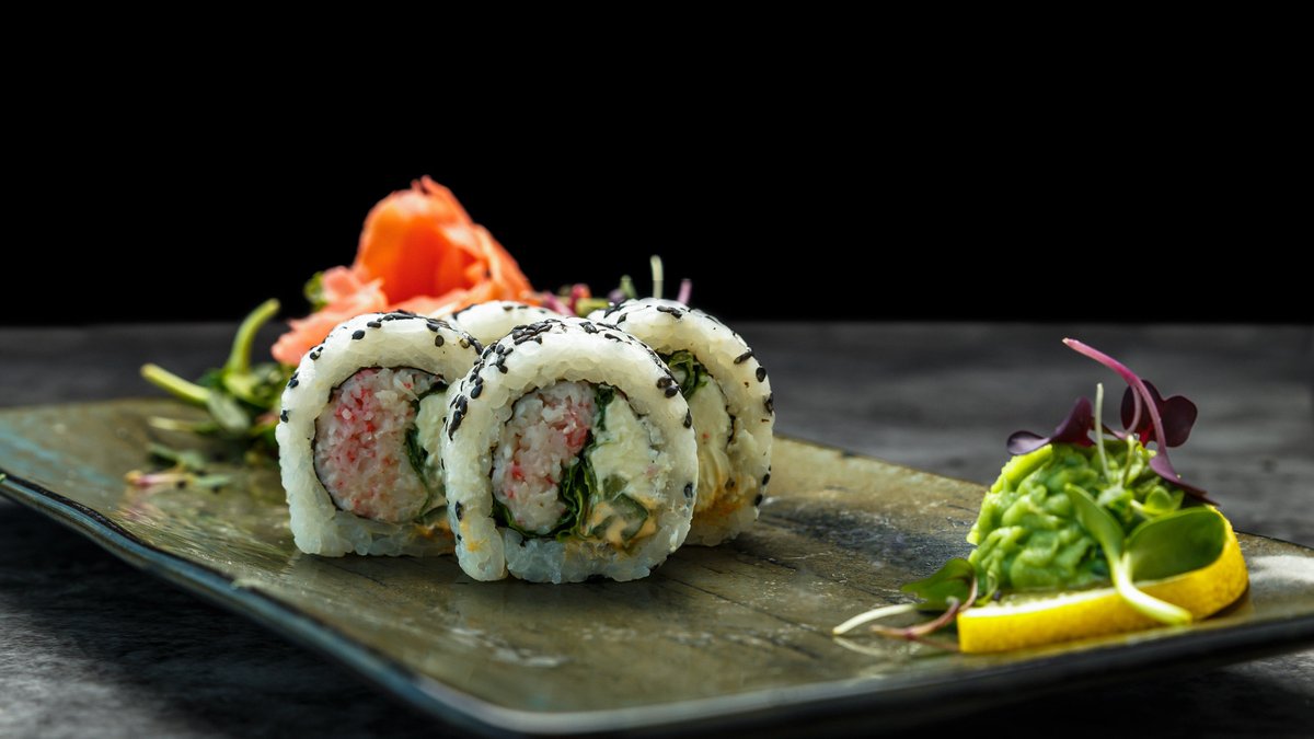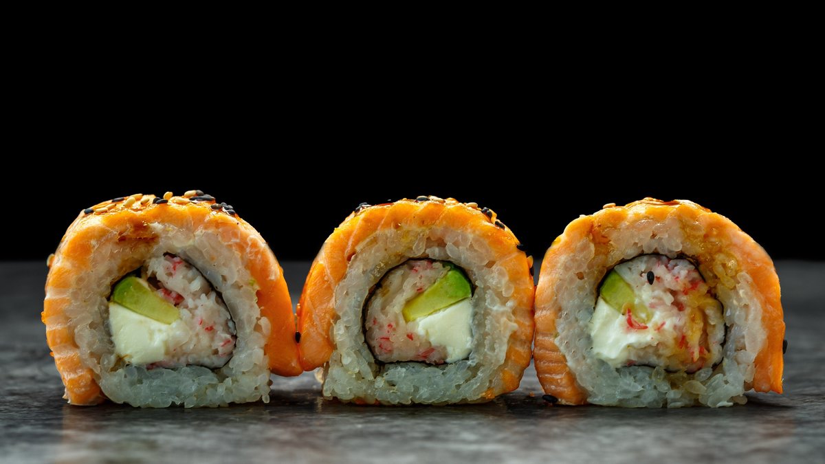 toorjuust, lumekrabi, lõhefilee, avokaado, majonees, unagi kaste, seesamiseemned