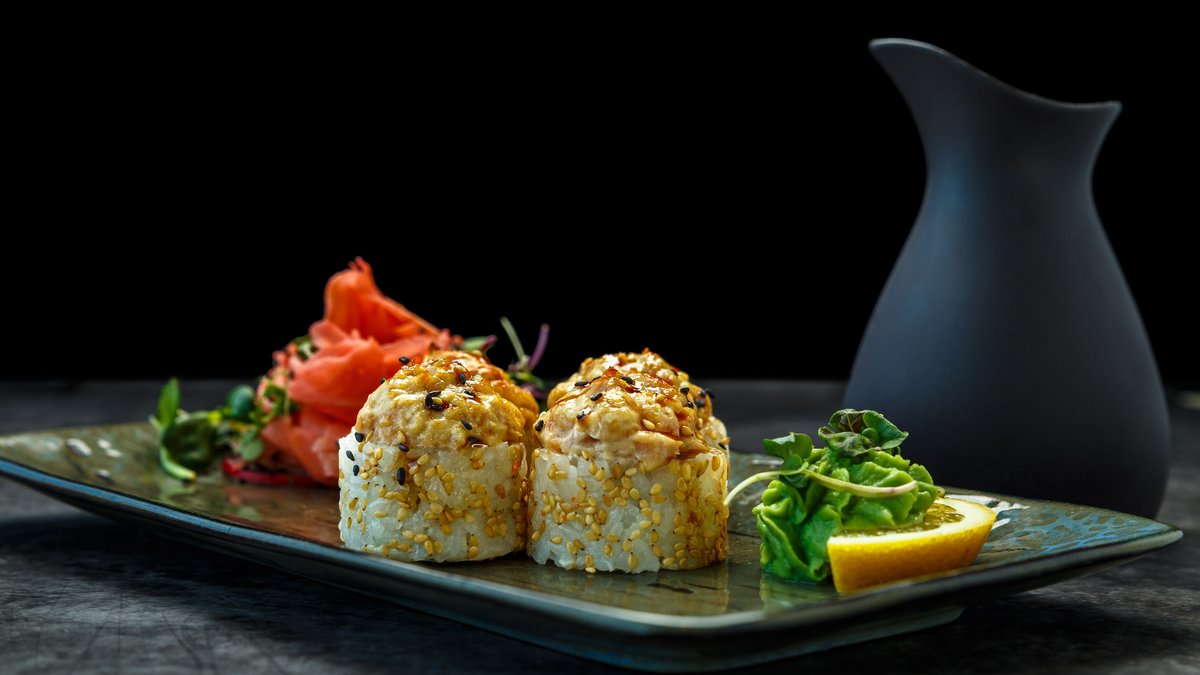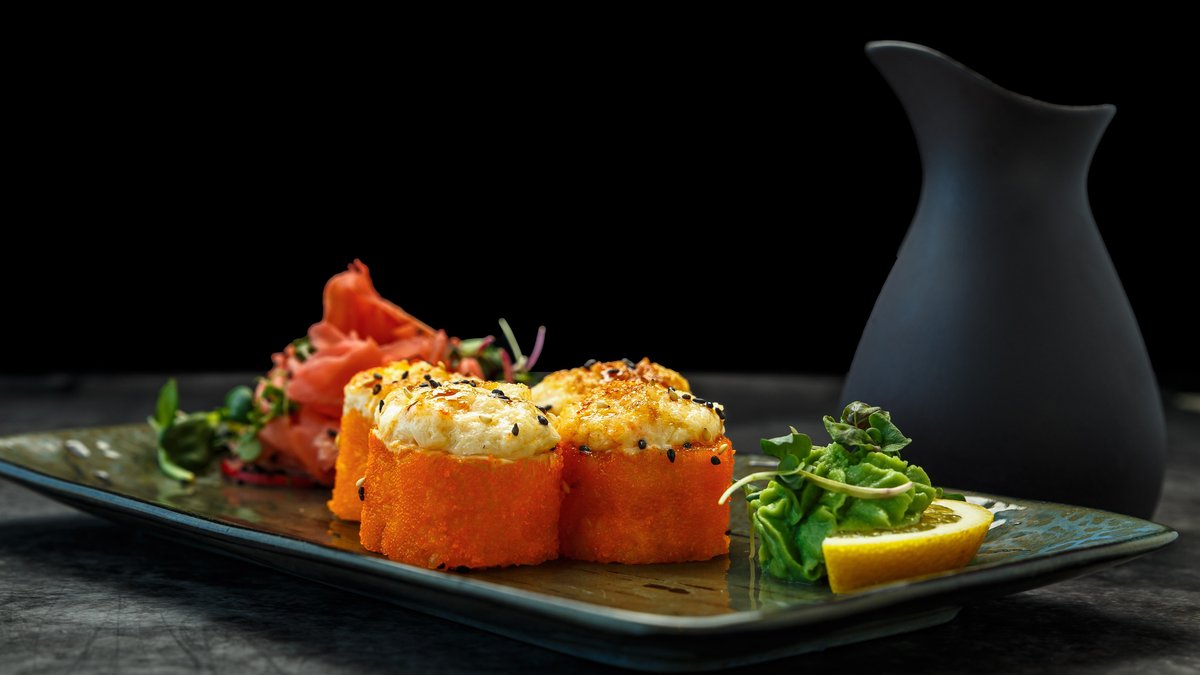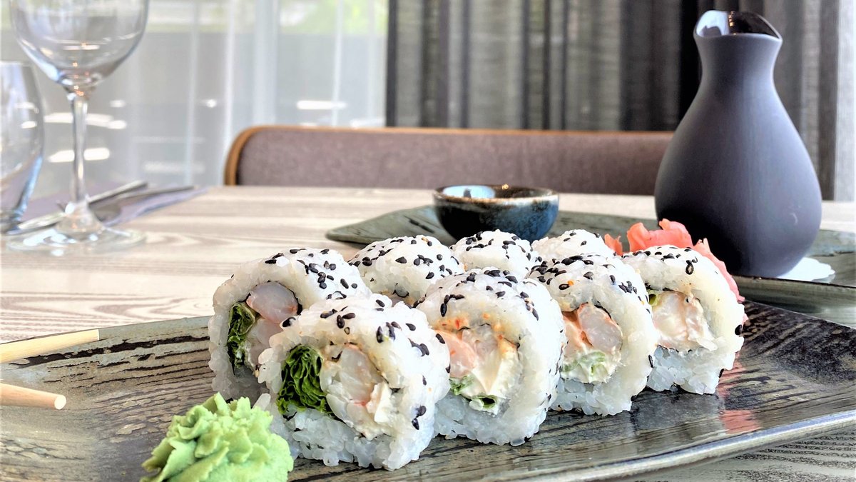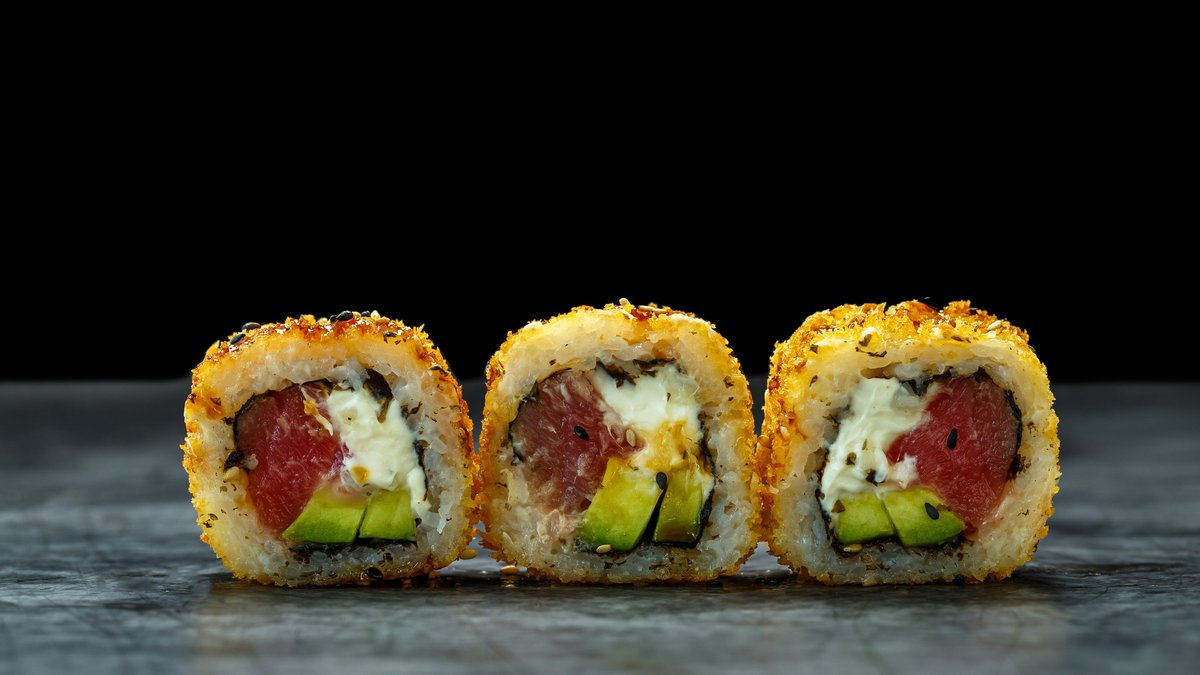 toorjuust, lumekrabi, lõhefilee, avokaado, majonees, unagi kaste, seesamiseemned