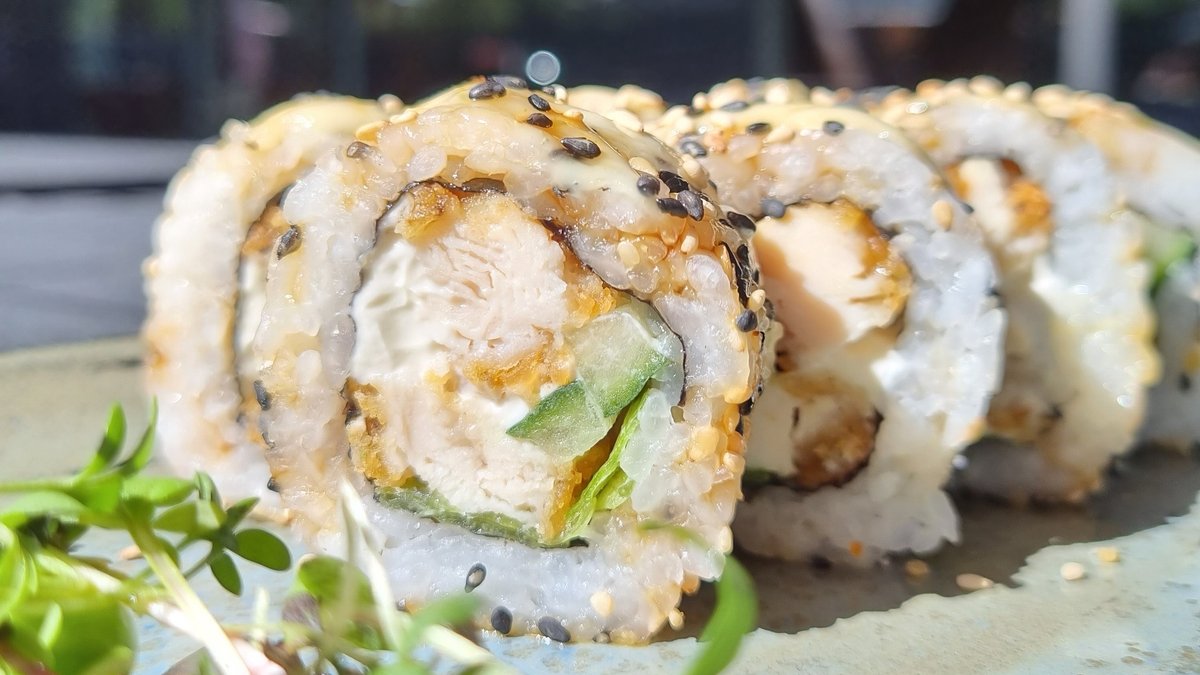 nori, sushiriis, kreemjuust, tomat, frillice salat, paneeritud kana, caesari kaste, unagi kaste, seesamiseemned