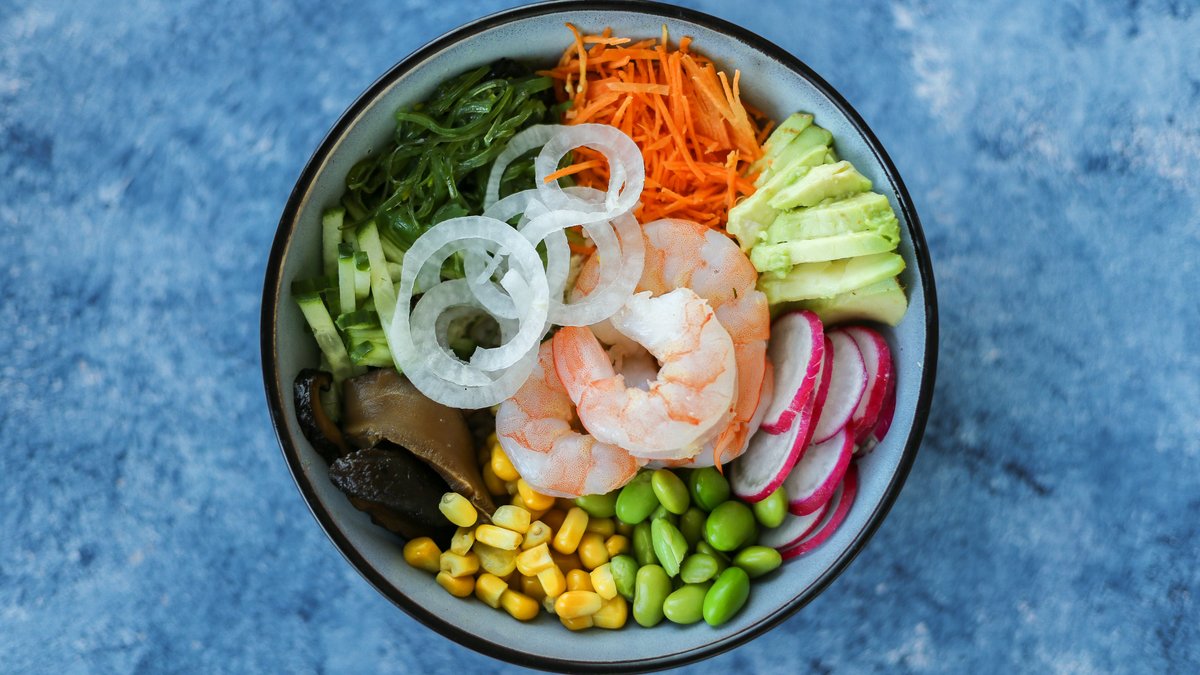 sushiriis, avokaado, edamame oad, kurk, mais, punane kapsas, merevetikasalat, punane redis, porgand, seesam, poke kaste, hiidkrevetid