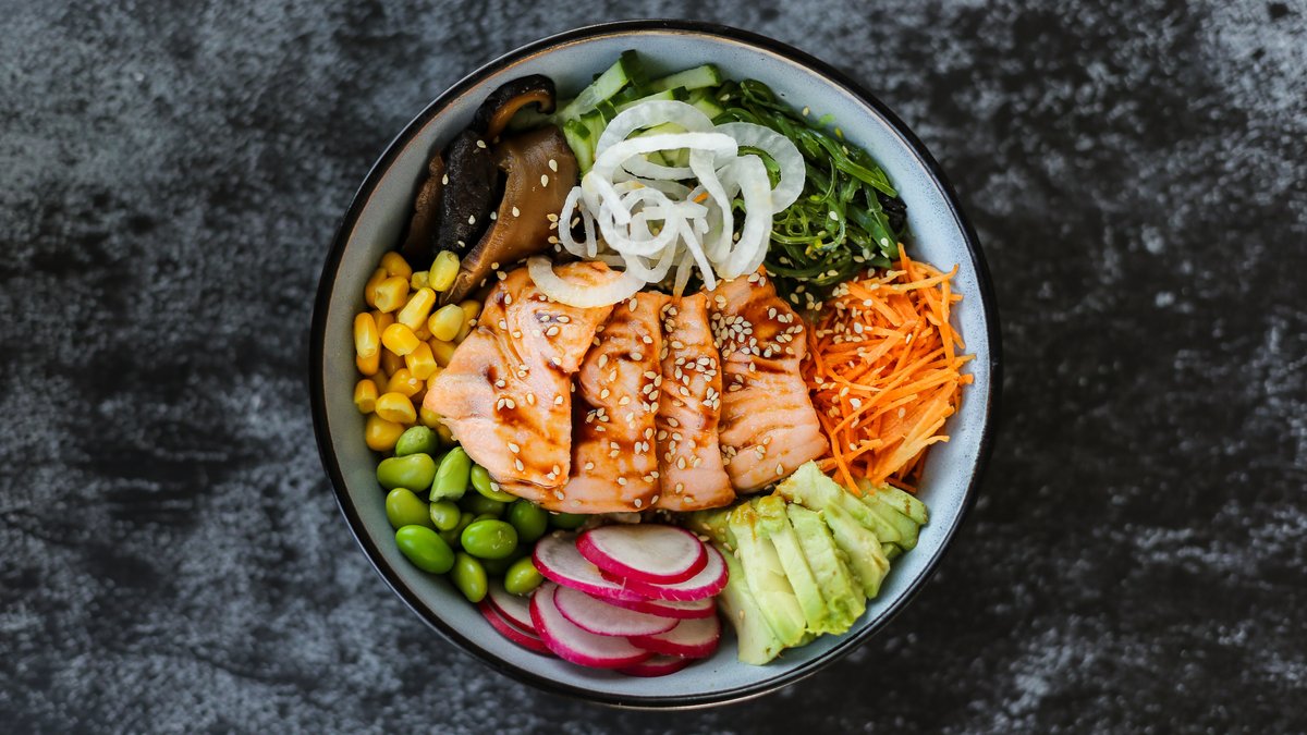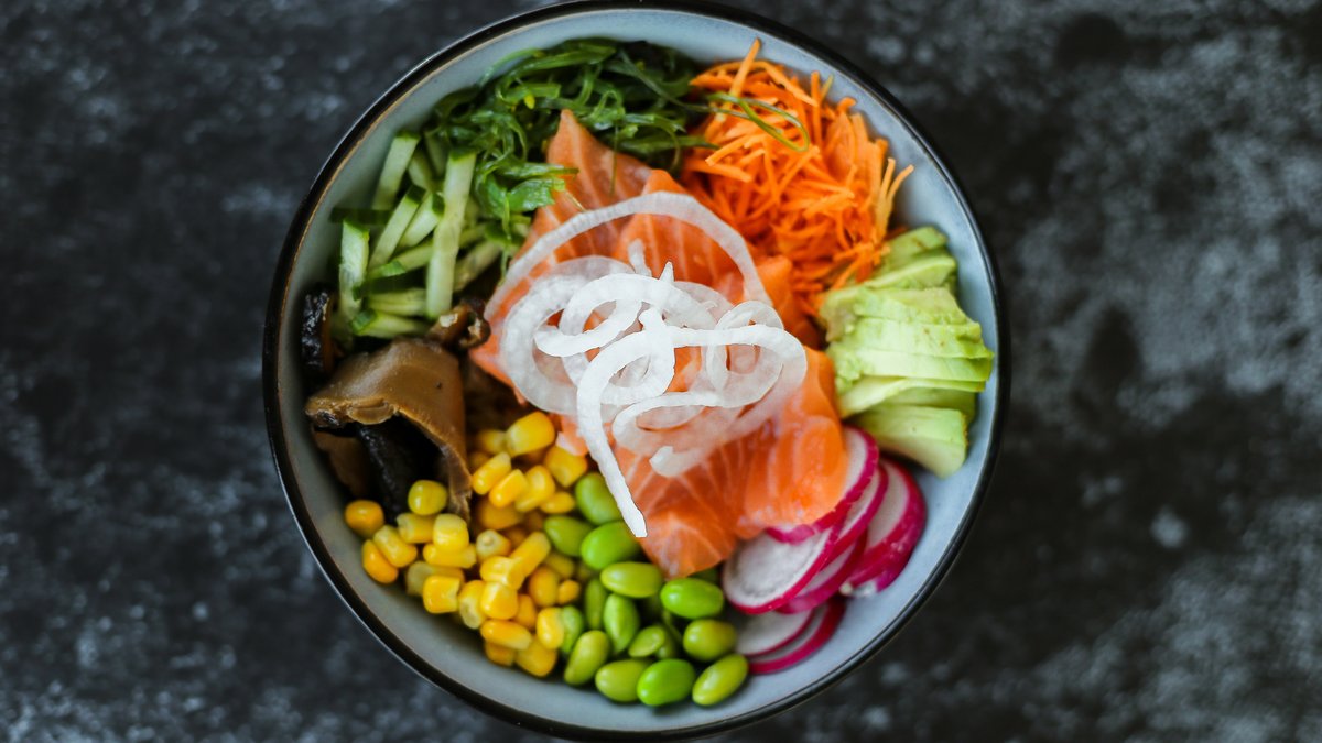 sushiriis, avokaado, edamame oad, kurk, mais, punane kapsas, merevetikasalat, punane redis, porgand, seesam, lõhe, poke kaste