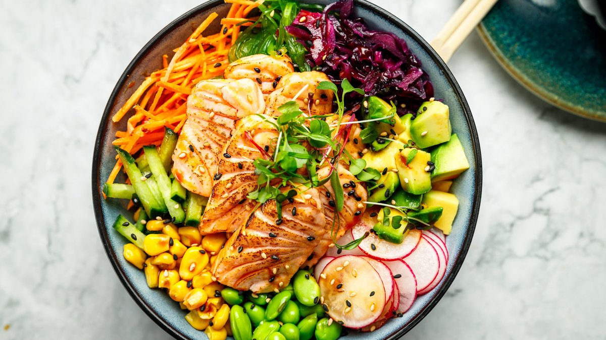sushiriis, avokaado, edamame oad, kurk, mais, punane kapsas, merevetikasalat, punane redis, porgand, seesam, küpsetatud lõhe, poke kaste