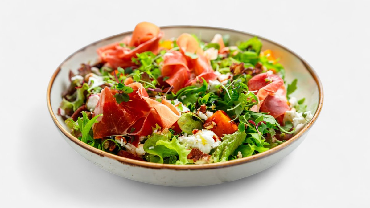 Krõbe baklažaan hoisin glasuuris, salatimix, kirsstomatid ja stracciatella