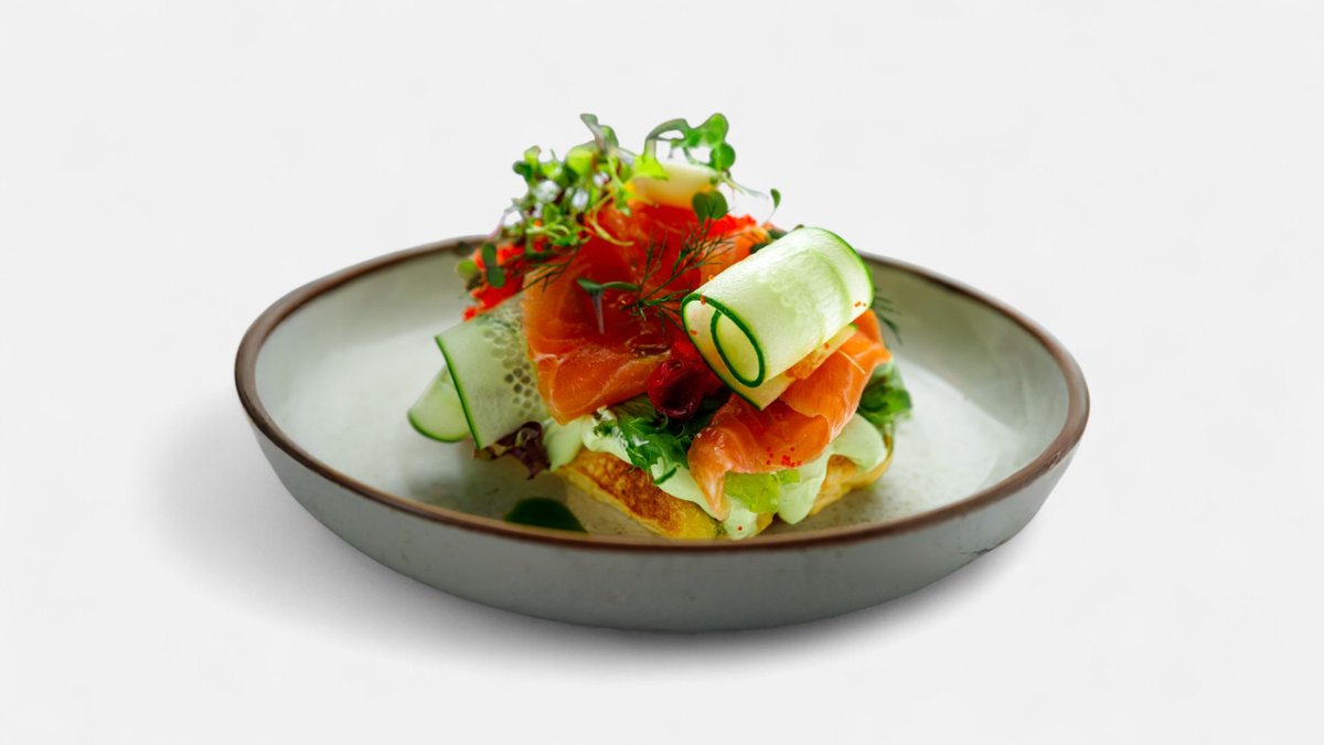 Kartulivahvel, soolalõhe, salatimix, marineeritud pärlsibul, toorjuust, vutimuna, till, roheline õli
