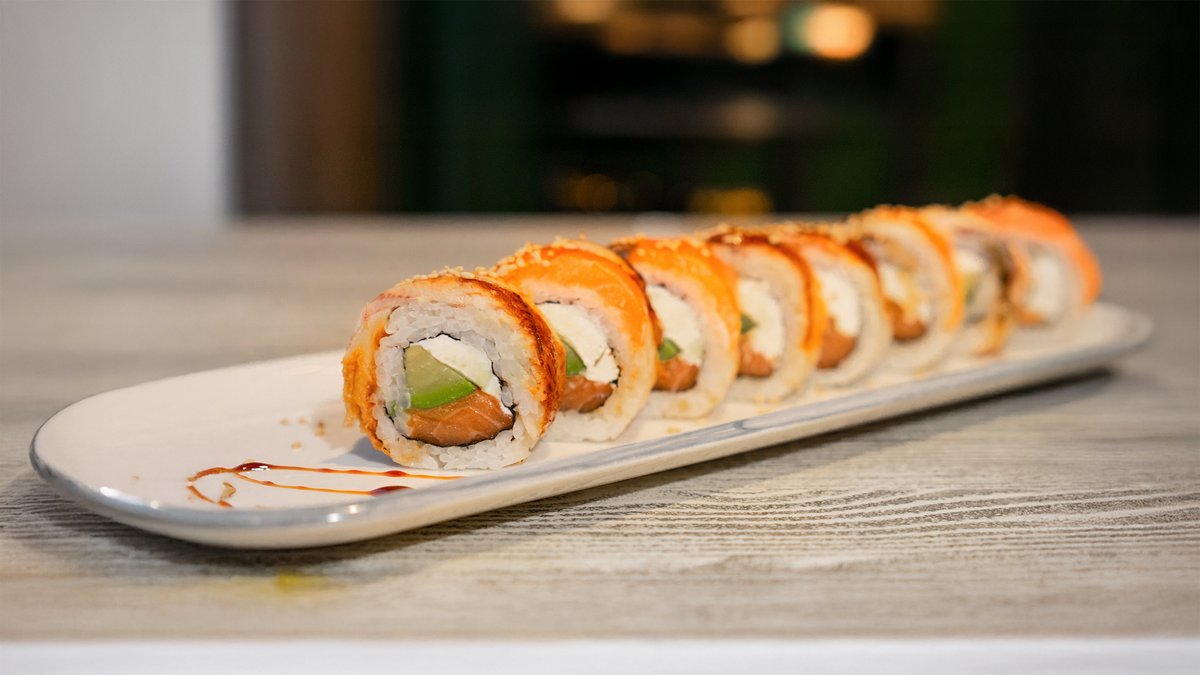kreemjuust, lõhefilee, kurk, avokaado, terav lumekrabi, masago, majonees, unagi kaste, seesam