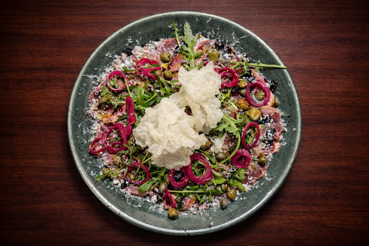 Pardi carpaccio riivitud juustu, kapparite ja riisiõhikuga