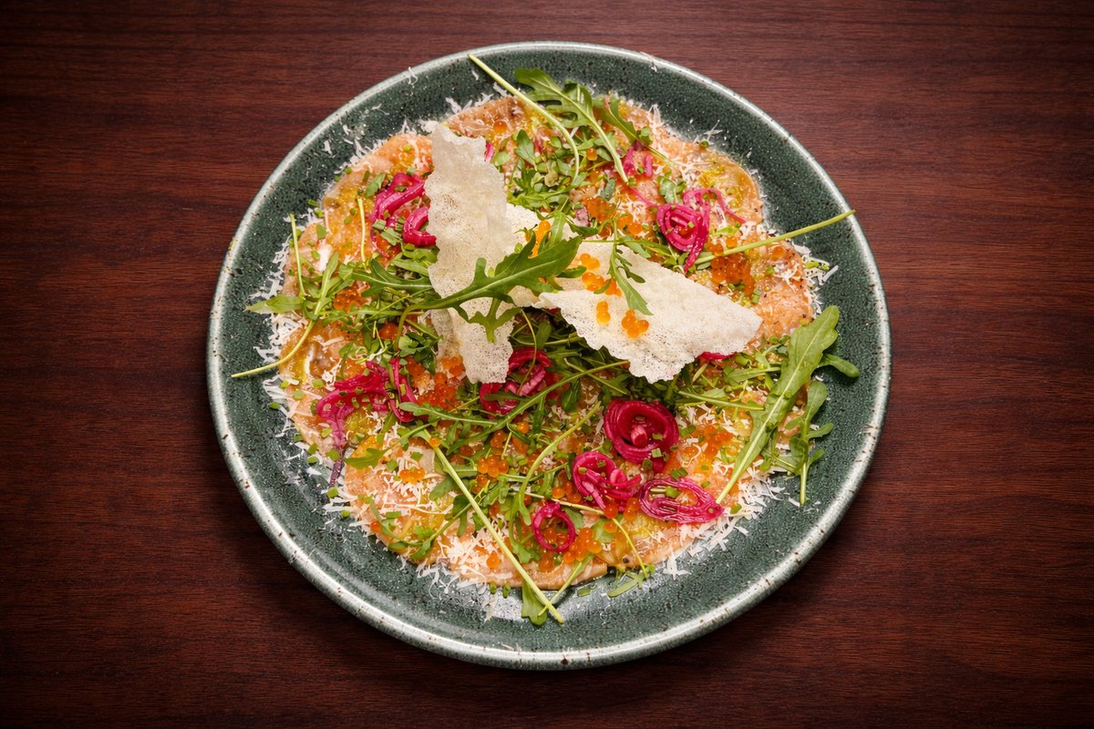 Lõhe carpaccio riivitud juustu, kapparite ja riisiõhikuga
