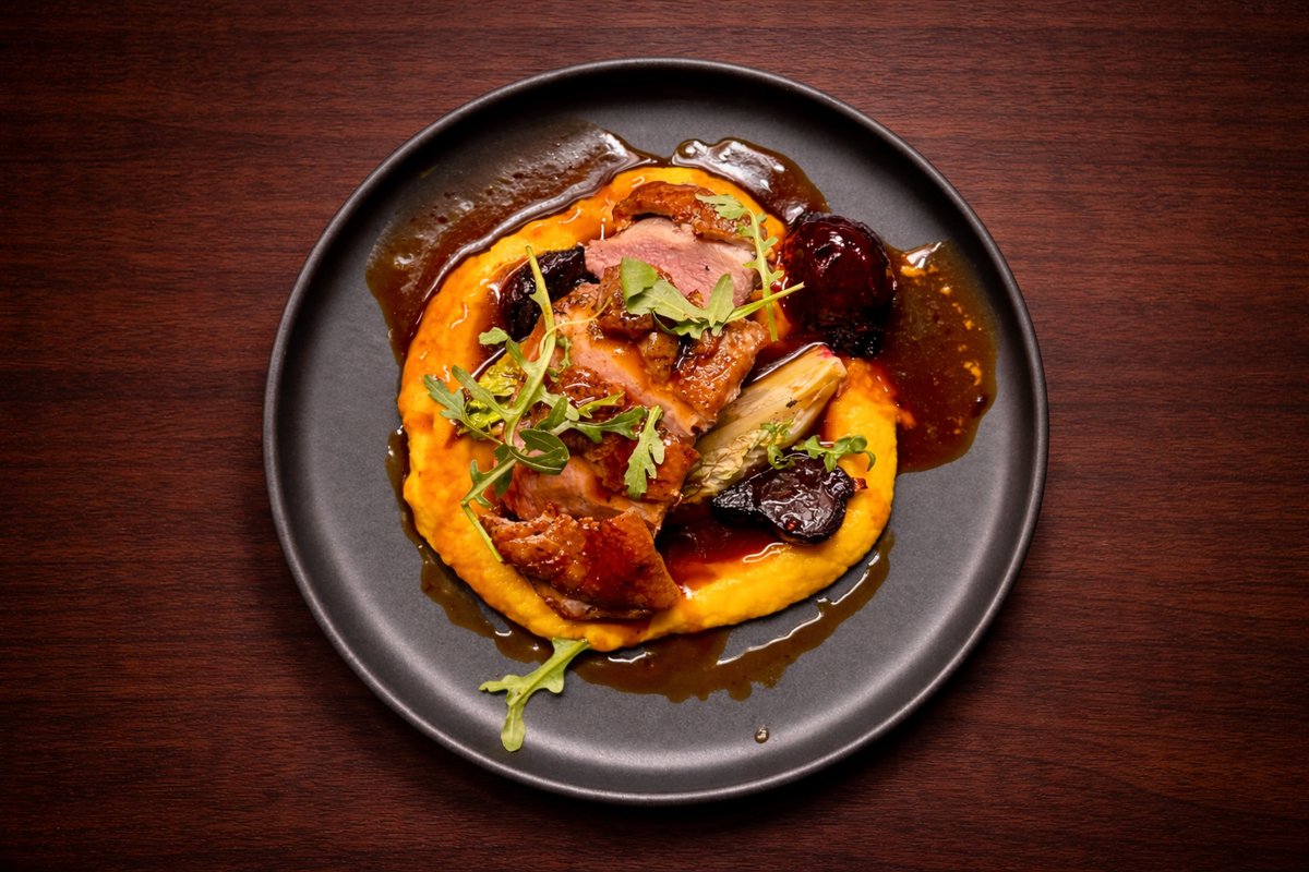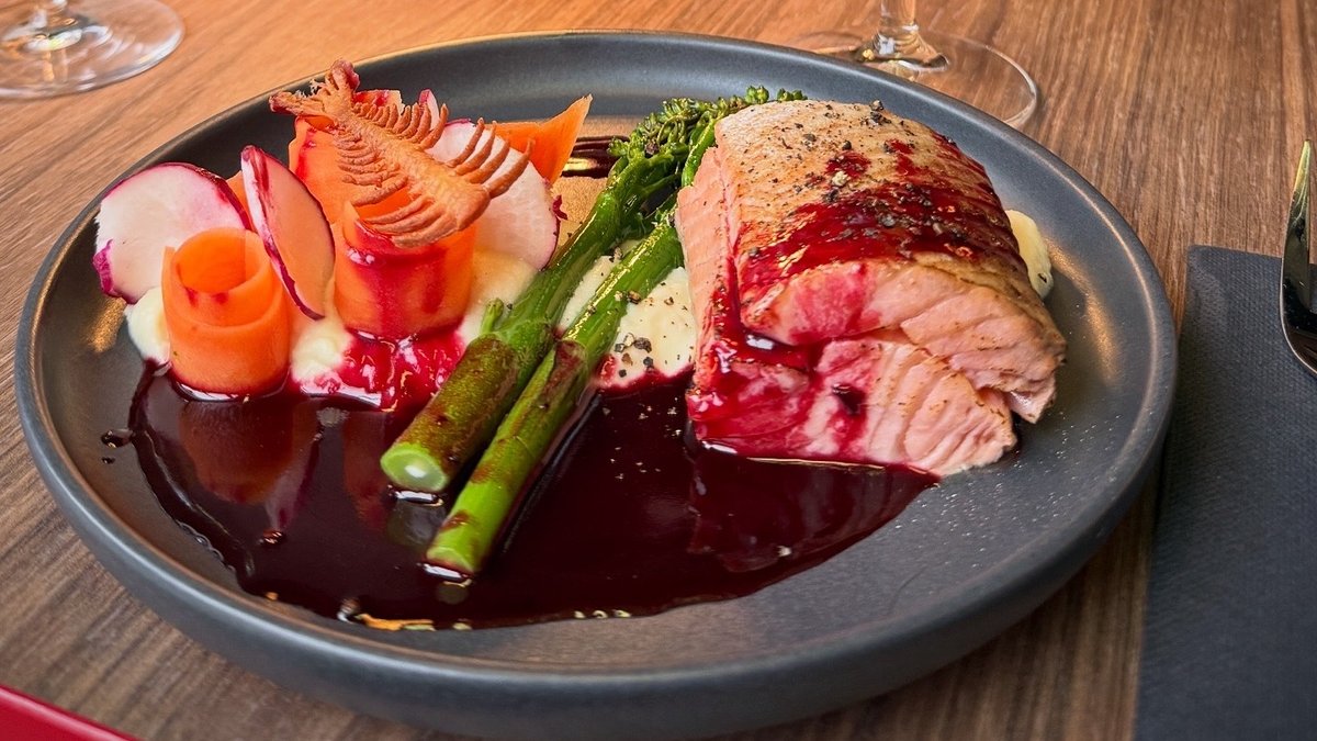 Pardifilee punaveini-estragonikastme, porgandi-juursellerikreemi ja soolatud peediga