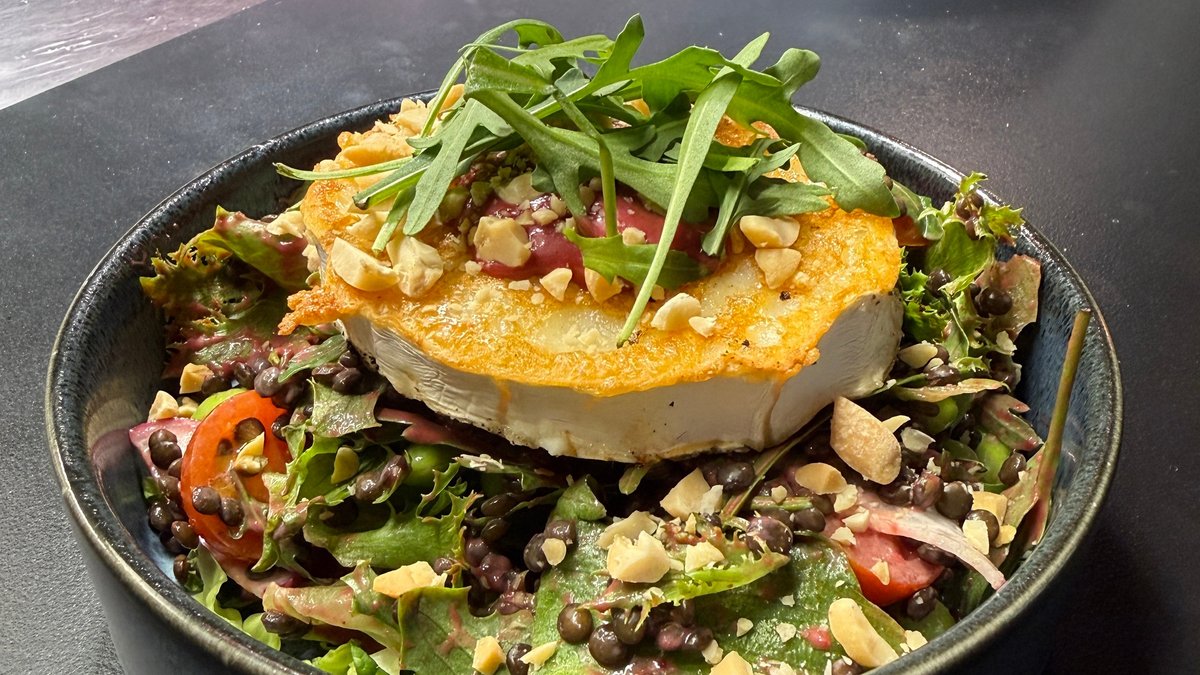 Kitsejuustusalat mustade läätsede, pähklite ja kirsikastmega
