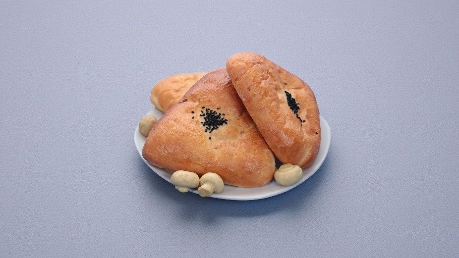 Suur pirukas kana ja seentega ( keedetud kanafilee, suitsutatud kanafilee, praetud šampinjonid, jahu, või, piim, munad, suhkur, pärm)