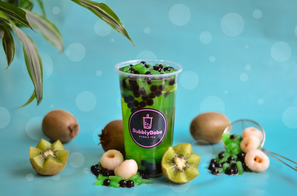 Kiivi-, litši- ja sidrunimaitseline roheline tee õuna želee ja tapiokiga. Joogiga tuleb kaasa üks joogikõrs.