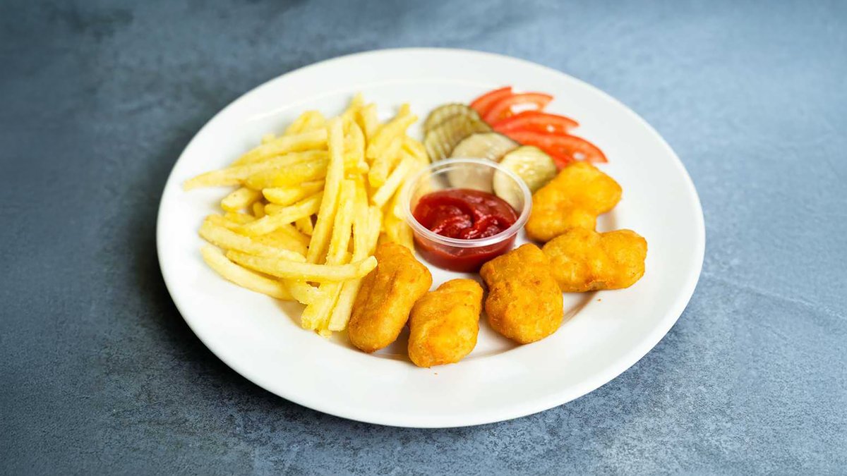 Friikartul, tomat, marineeritud kurk, ketšup, 5x kananagitsad, kõrrejook