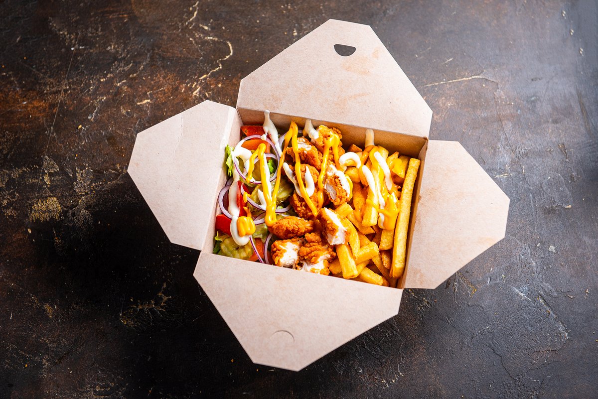 Friikartul,jääsalat,tomat,marineeritud kurk,punane sibul,krõbekana,küüslaugumajoneesikaste,cheddarjuustu kaste.