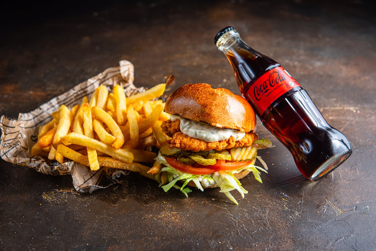 Krõbekana burger, friikartul, jook